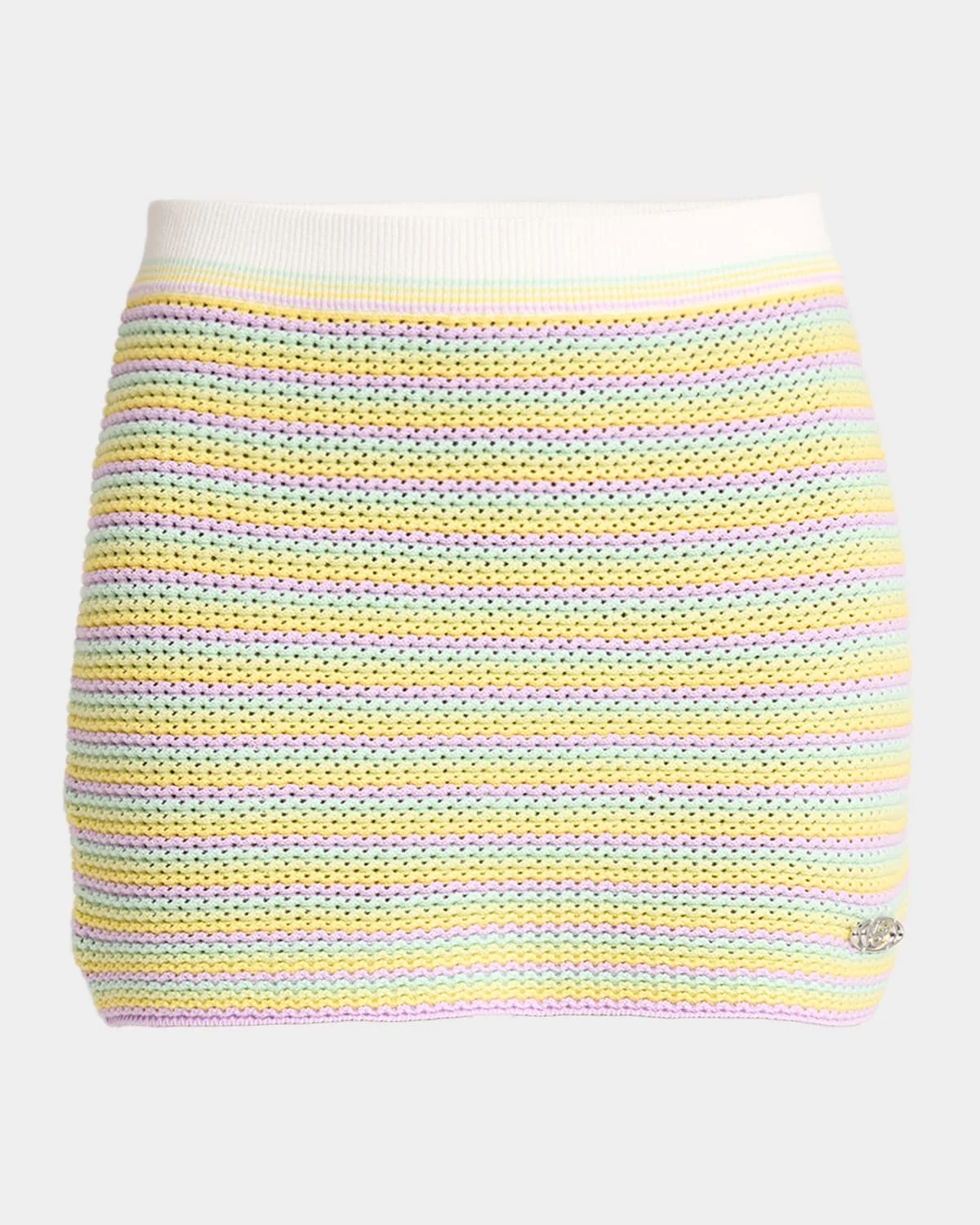 Crafted of & nbsp;crochet knit, the "Bourgeois Stripe" skirt from CASABLANCA is detailed with a rib-knit waistband and a metal logo tag at the hem. Mid waist Skirt falls straight from hip to hem Mini length Rib-knit waistband Pull-on style Cotton Machine wash Imported SIZE & FITModel measurements: 5 & apos;10" tallModel is wearing a US size 4/Small