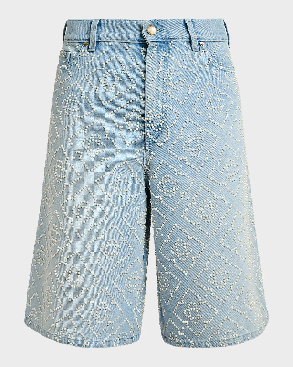 Men & apos;s Pearly Monogram Wide-Leg Denim Shorts