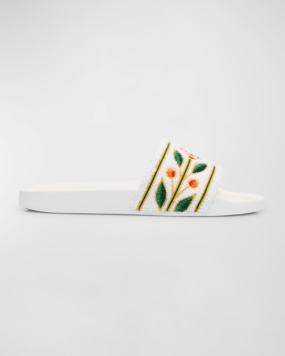 - CASABLANCA floral-embroidered terry cotton pool sandals - Flat heel - Open toe - Wide band upper - Slide style - Molded comfort footbed - Rubber outsole - Professional cleaning recommended, spot clean - Imported