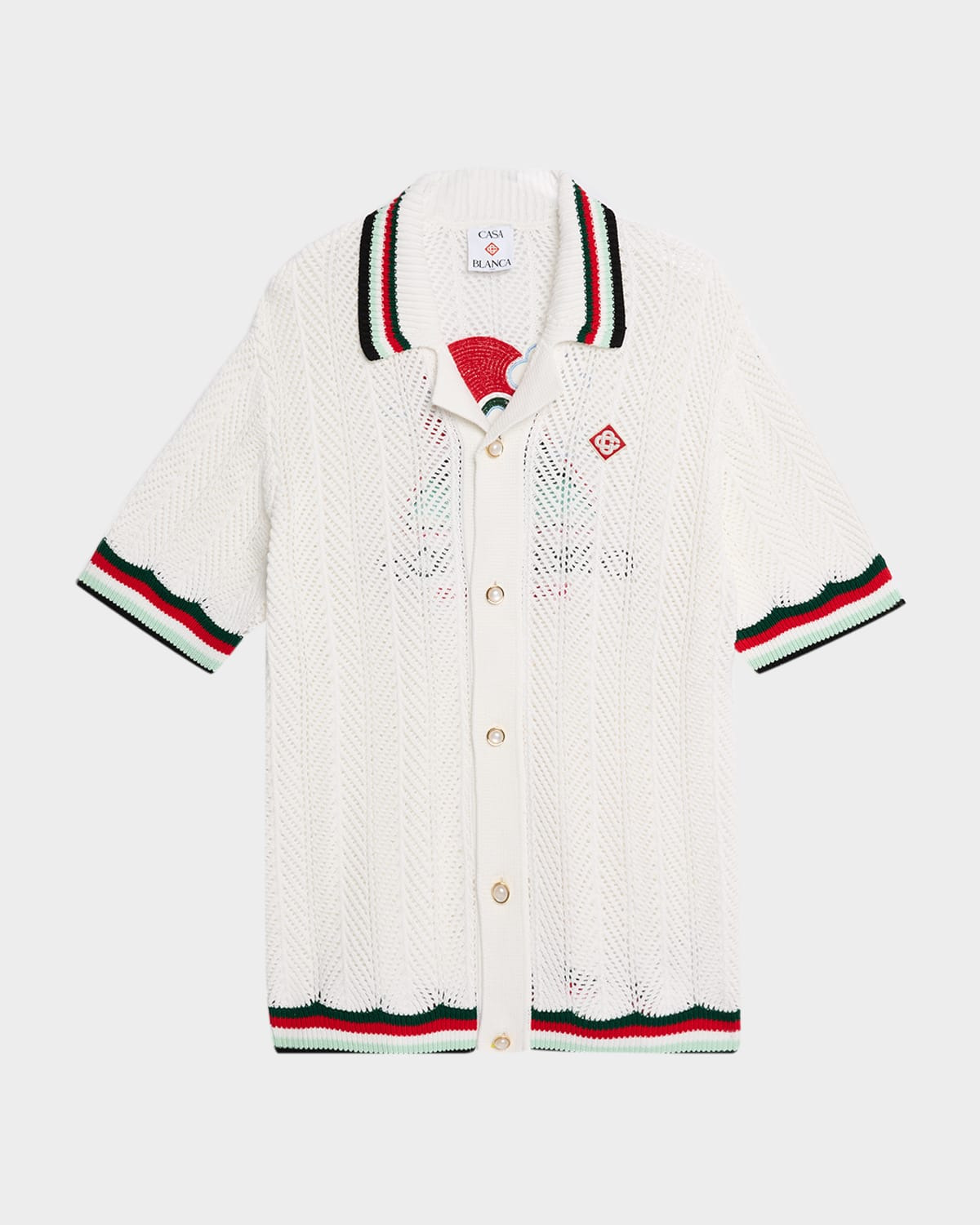 - CASABLANCA shirt showcasing a sporty open faux crochet design with scalloped stripe ribbed trims - Notch collar - Button front - Pearly buttons - Short sleeves - Cotton - Dry clean - Imported