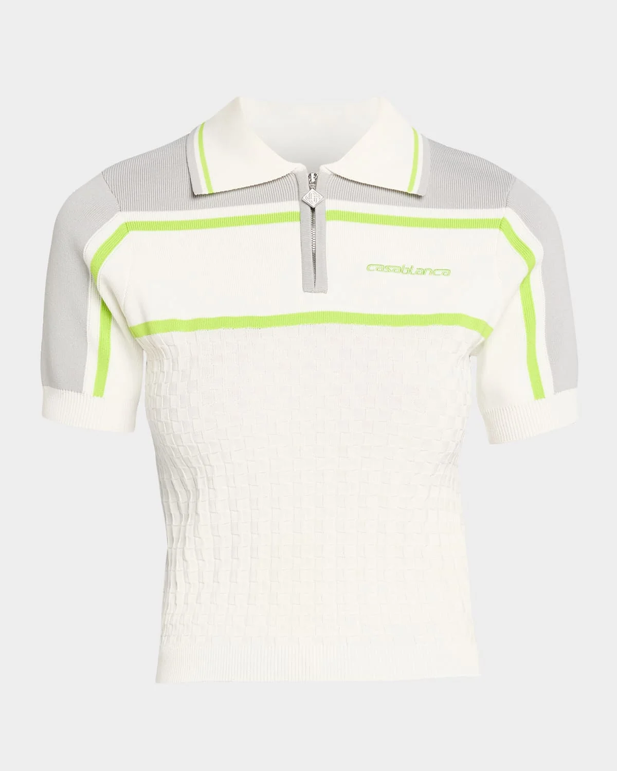 This CASABLANCA tennis polo shirt is crafted in a textured check knit with contrast stripes, embroidered logo, and logo zipper pull Spread collar; partial zip front Short sleeves Cropped style Relaxed fit Pullover style Viscose/nylon/polyamide Imported