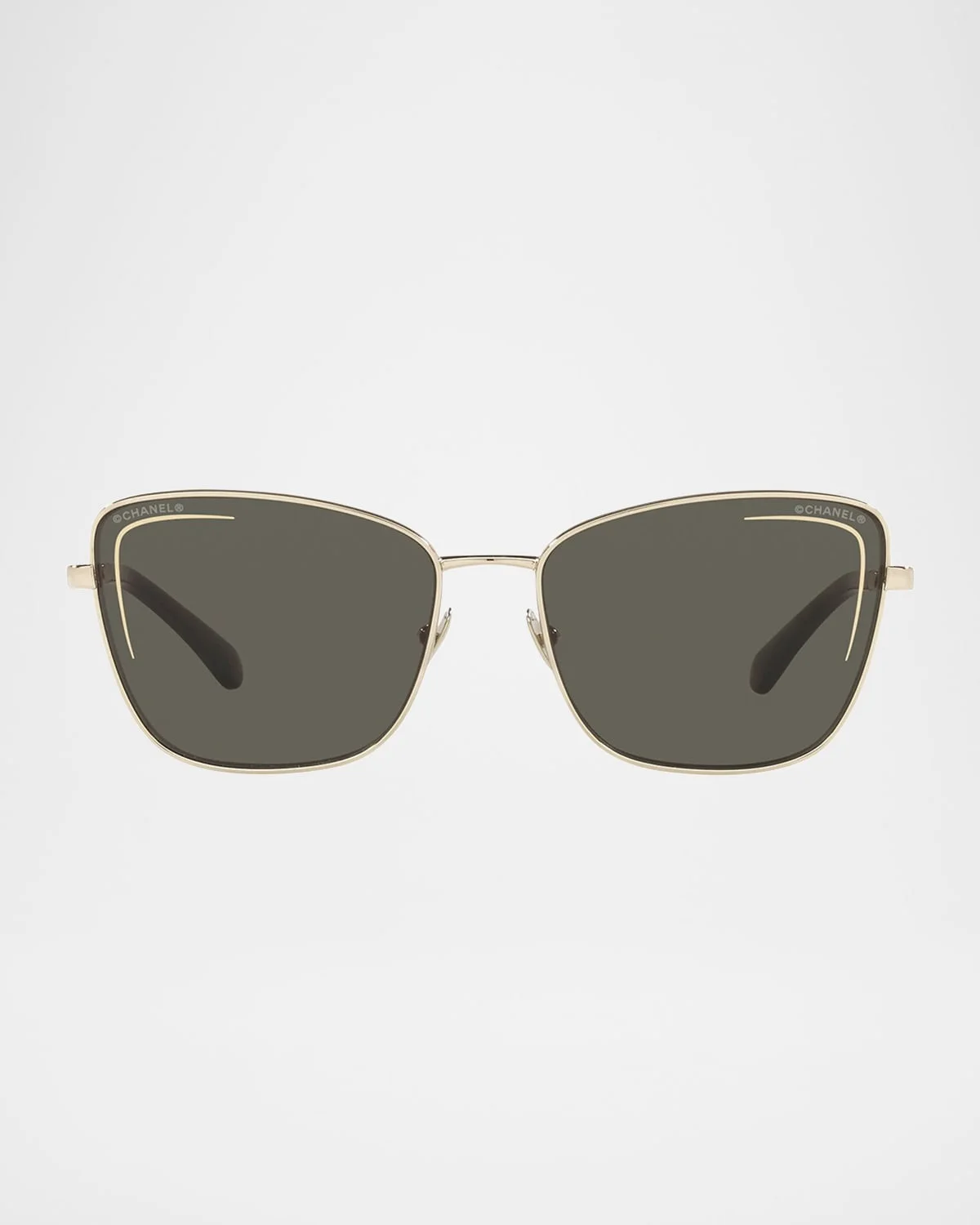 CHANEL cat-eye sunglasses in metal & nbsp; Lens/bridge/temple (in mm): 57-16-140 Solid-color lenses; logo script & nbsp; Adjustable nose pads & nbsp; Engraved logo on temples & nbsp; Thin, tapered arms & nbsp; Capped earpieces & nbsp; 100% UVA/UVB protection Made in Italy Proposition 65 warning for California residentsDue to high demand, these items may no longer be available in store.Discover more from the CHANEL. [DELIVERY NAME] Collection at select Neiman Marcus stores.