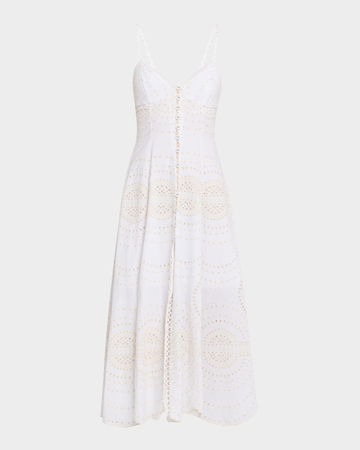 - CHARO RUIZ IBIZA "Catta" dress crafted in an embroidered cotton-linen blend - V neckline - Sleeveless - Scalloped hem falls below the knee - Flattering body-skimming silhouette - Button front closure - Cotton/linen/polyester - Imported