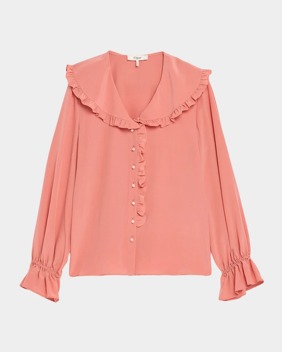 - Chloe top is crafted of a flowy silk finished with a Bertha collar and ruffle trim - V-neckline; button front - Long blouson sleeves - Elasticized ruffle cuffs - Relaxed fit - Silk - Dry clean, professional cleaning recommended - Made in France