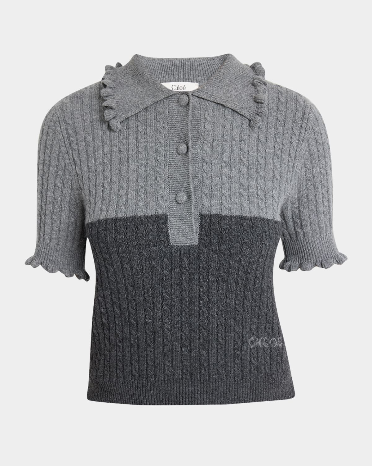 - Chloe two-tone knit polo sweater reimagines a classic style with ruffle trim and fabric-covered buttons - Spread collar; three-button placket - Short sleeves - Hip length - Fitted - Pullover style - Wool/cashmere - Dry clean - Imported