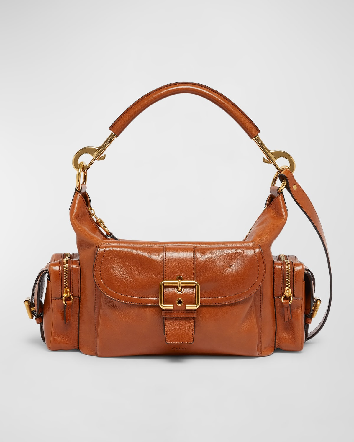 - Chloe camera top handle bag in calfskin leather - Detachable top handle - Detachable, adjustable crossbody strap - Can be worn as a top handle or crossbody bag - Zip top closure - Exterior, two zip pouches and one buckle flap pouch - Interior, one slip pocket - Lining: Cotton/linen - Approx. 6.2"H x 13.3"W x 5.9"D - Made in Italy