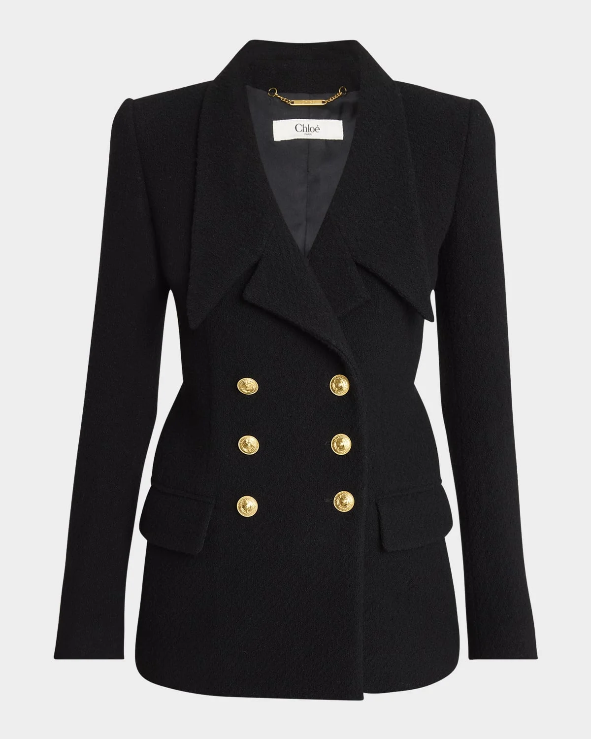 - Chloe boucle jacket featuring cascading lapels and signature goldtone buttons - Cascade notch lapels; double-breasted front - Long sleeves; button cuffs - Padded shoulders - Hip flap pockets - Tailored fit - Hem falls below the hip - Wool/nylon/polyamide/elastane - Lining: Silk - Dry clean - Made in Italy