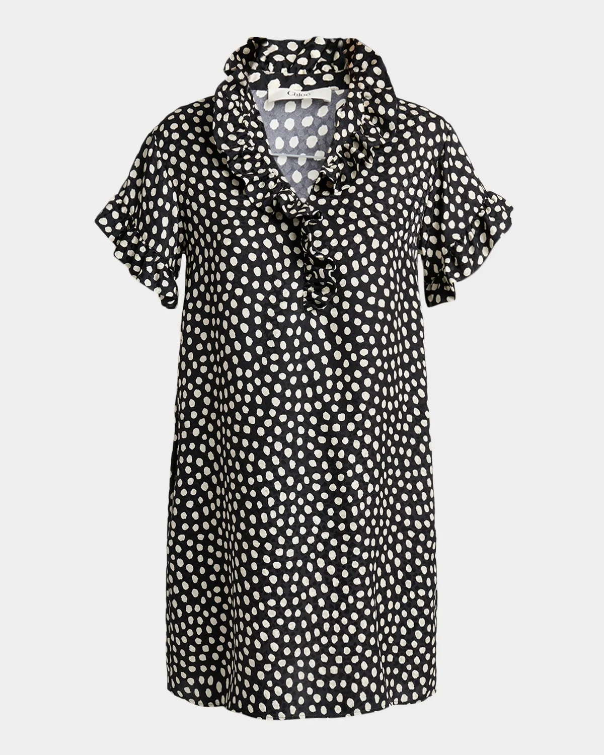 Chloe dress is crafted from dots printed silk jacquard accented with ruffles along the collar and sleeves Shawl collar; button front Short sleeves Shift silhouette Midthigh length Slipover style Silk/motherofpearl buttons Made in Italy
