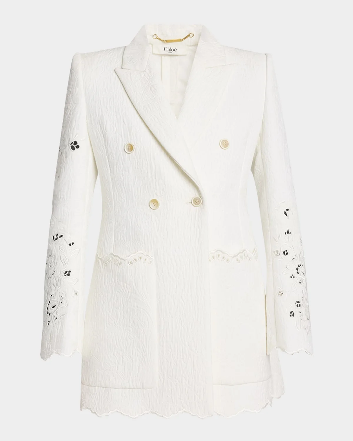 - Chloe jacket crafted in spongy jacquard with tonal floral broderie anglaise - Detailed with scalloped embroidered edges - Peak lapels; double-breasted front - Long sleeves - Side patch pockets - Double-vented back - A-line fit - Cotton/nylon/polyamide/linen - Lining: Cotton - Dry clean - Imported