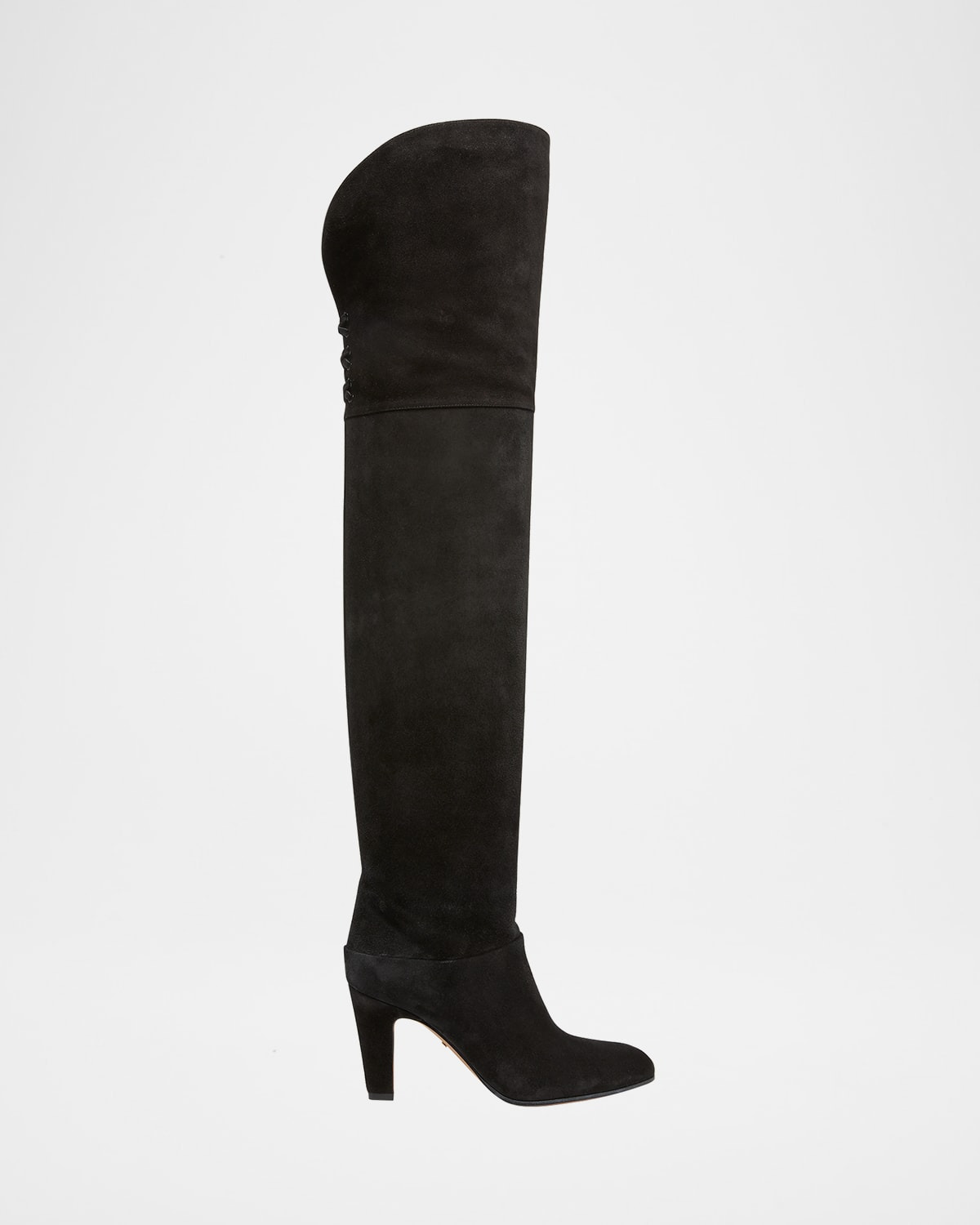 Exuding equestrianinspired glamour, the "Eve" boots by Chloe are crafted in supple suede with back laceup detailing for a subtle Western touch 3.25 in / 85 mm covered stiletto heel Closed almond toe Dramatic curved collar Formfitting shaft elongates the leg Pullon style Professional cleaning recommended Made in Italy
