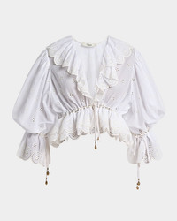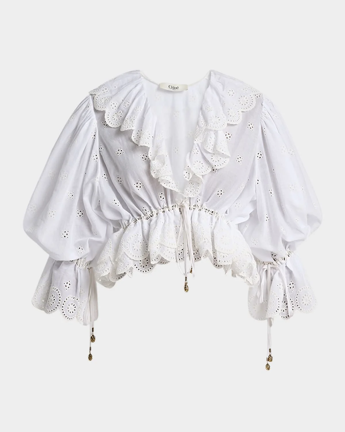- Chloe peasant blouse in eyelet embroidered cotton with scalloped ruffles and a drawstring cinched waist - V neckline - 3/4 blouson sleeves - Self-tie ruffle cuffs - Relaxed fit - Cropped length - Ruffle hem - Self-tie front closure - Cotton/polyester - Dry clean - Imported