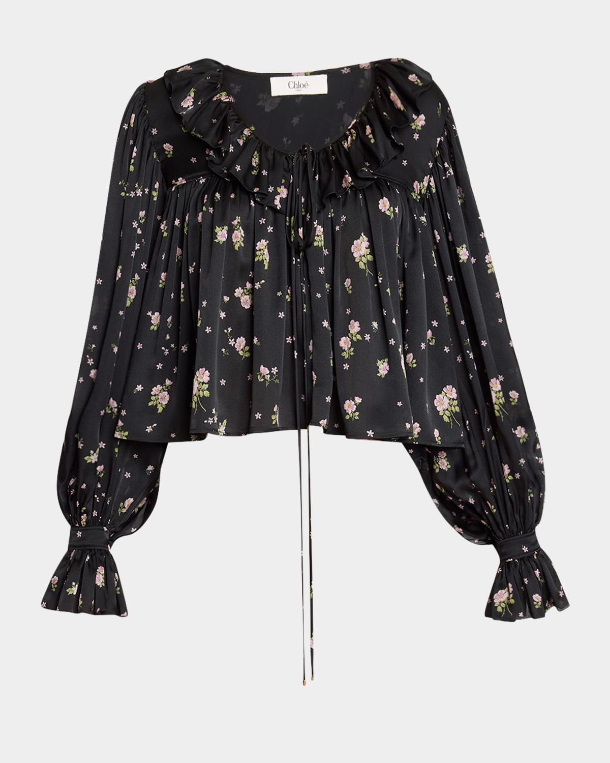 - Chloe floral printed silk peasant blouse featuring a ruffle neck detail and a chest yoke - Scoop neckline; self-tie keyhole front - Long sleeves; button ruffle cuffs - Loose fit - Hip length - Pullover style - Silk - Dry clean - Made in Italy