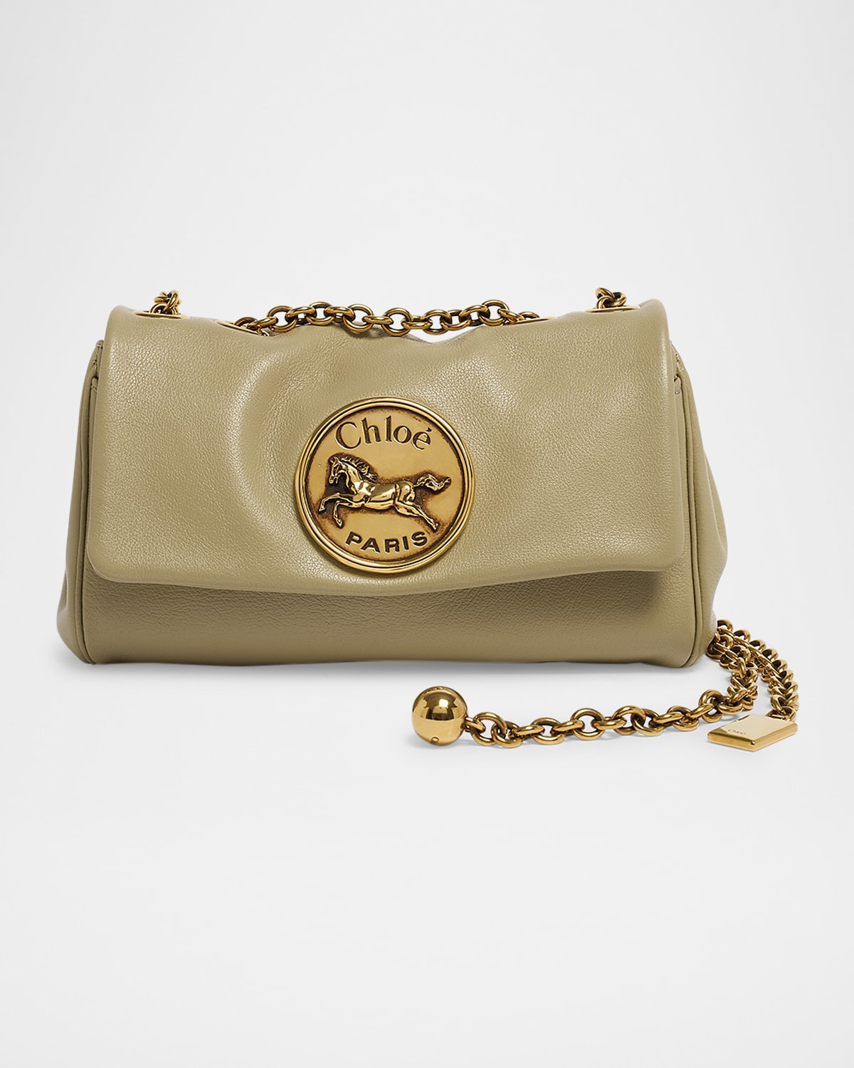- Chloe "Heritage" grained leather crossbody bag with Horse Medal hardware - Sliding chain crossbody strap can be doubled - Can be worn as a shoulder or crossbody bag - Flap top with snap closure - Exterior, one slip pocket under flap - Interior, one slip pocket - Approx. 5.1"H x 8.2"W x 2"D - Professional cleaning recommended - Made in Italy