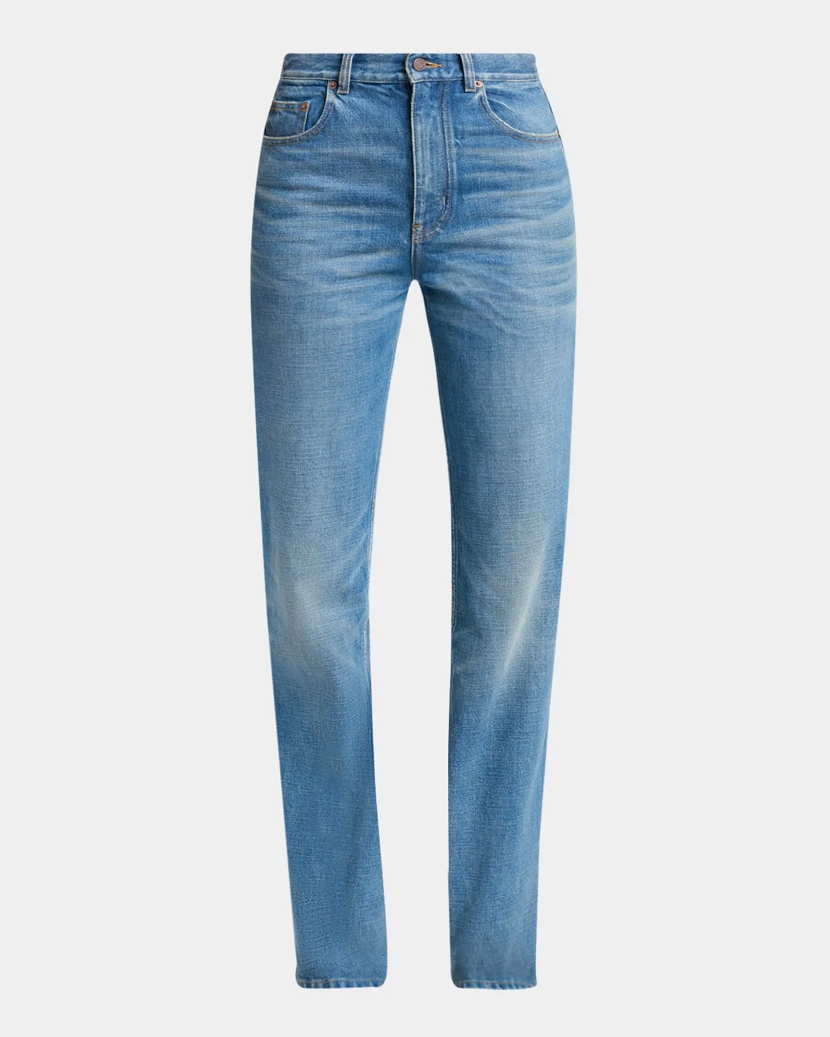 Crafted from medium-washed denim, these trousers & nbsp;from Chloe feature slight whiskering and fading High rise Five-pocket style Leather logo patch on the back Slim straight legs Full length Button/zip fly; belt loops Cotton/leather Professional cleaning recommended Made in Italy