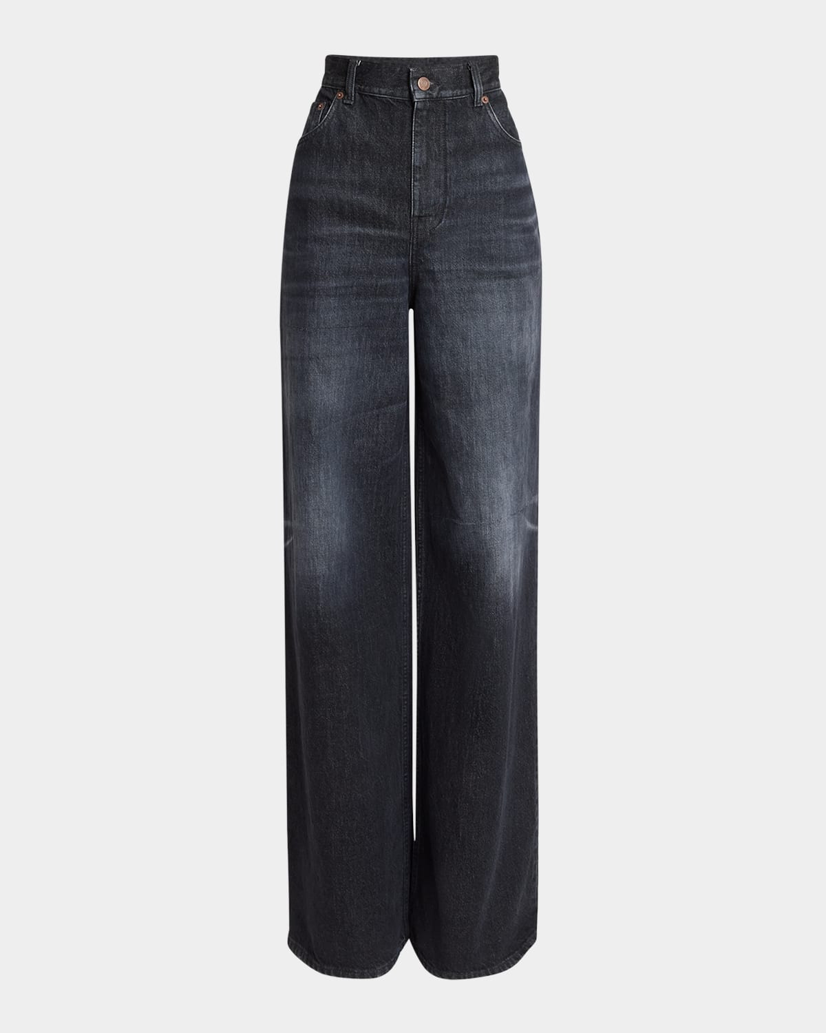- Chloe palazzo jeans in faded gray washed denim - High rise - Five-pocket style - Wide legs - Full length - Button/zip fly; belt loops - Cotton/leather - Made in Italy