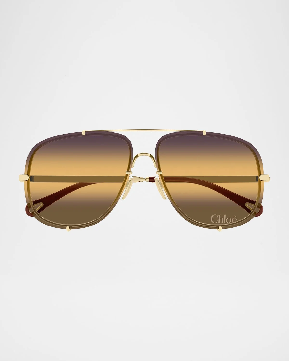 The "Ivy" sunglasses by Chloe pair a lightweight frame in metal with triple gradient lenses secured by metal hooks. Dropshaped openings on the temple tips make these sunglasses compatible with Chloe's eyewear jewelry. Lens/bridge/temple (in mm): 6212140 Aviator frames with brow bar Gradient lenses Saddle nose bridge Adjustable nose pads Thin, tapered arms Capped acetate temple tips Logo script engraved on the left lens and temples 100% UVA/UVB protection Made in Japan