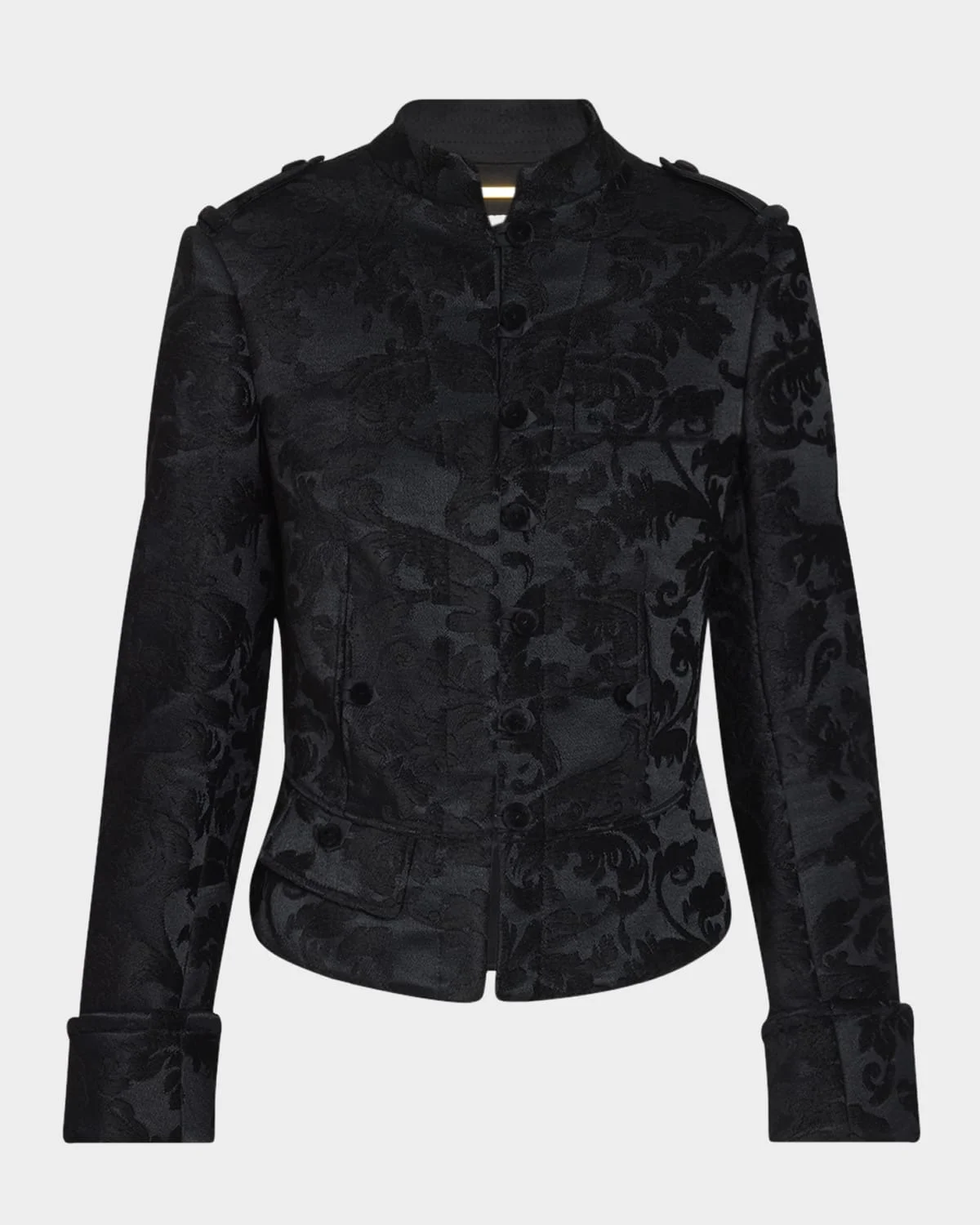 - Chloe jacket in damask velvet jacquard - Band collar; single-breasted front - Long sleeves; rolled cuffs - Shoulder epaulets - Chest welt pocket - Hip button welt pockets; button flap pockets - Slim tailored fit - Hip length - Viscose/cotton - Lining: Silk - Dry clean - Made in Italy
