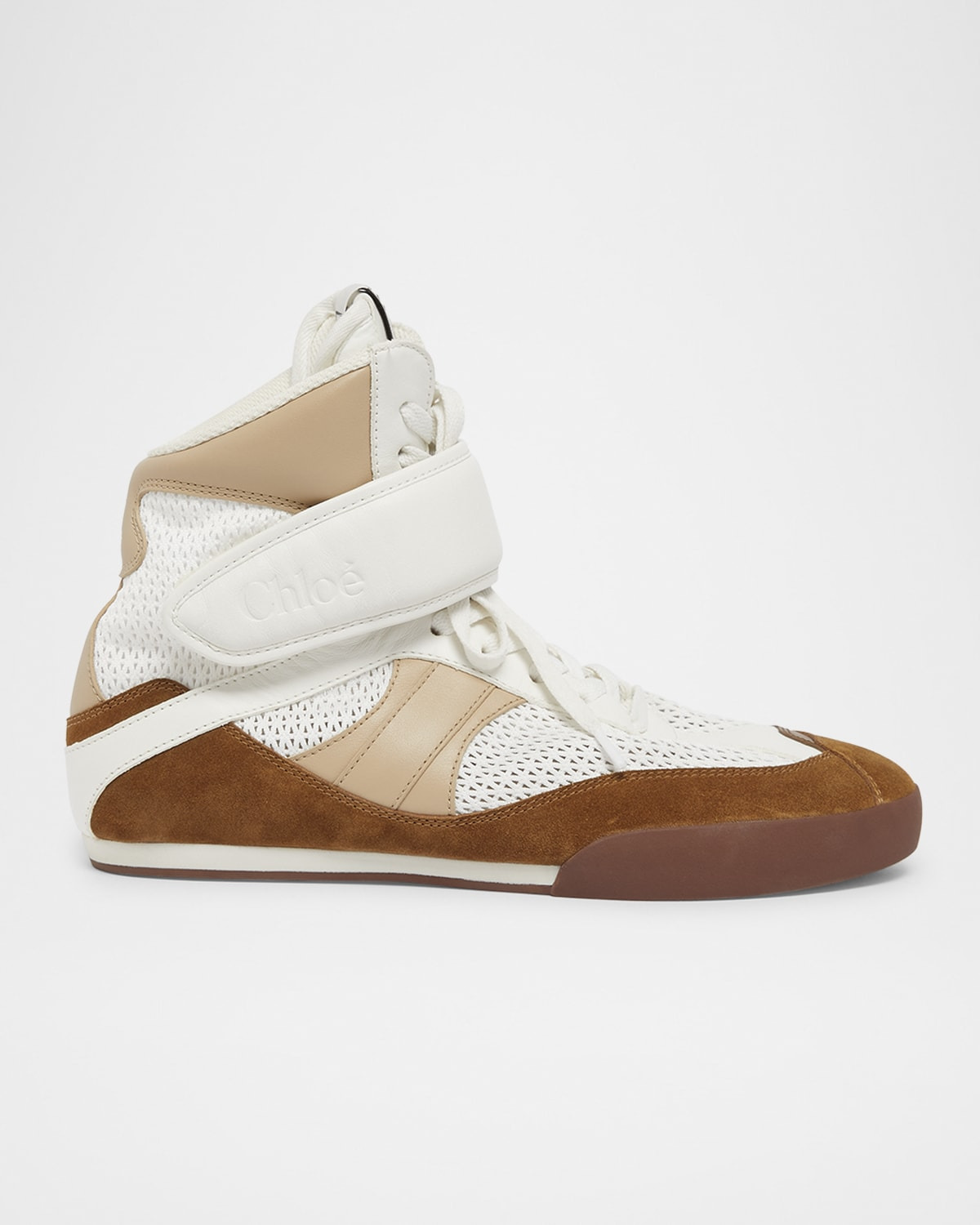 - Chloe kick high-top sneakers in mesh suede and leather - 0.75 in / 20 mm flat heel - Round toe - Lace-up vamp with strap accent - Rubber outsole - Imported