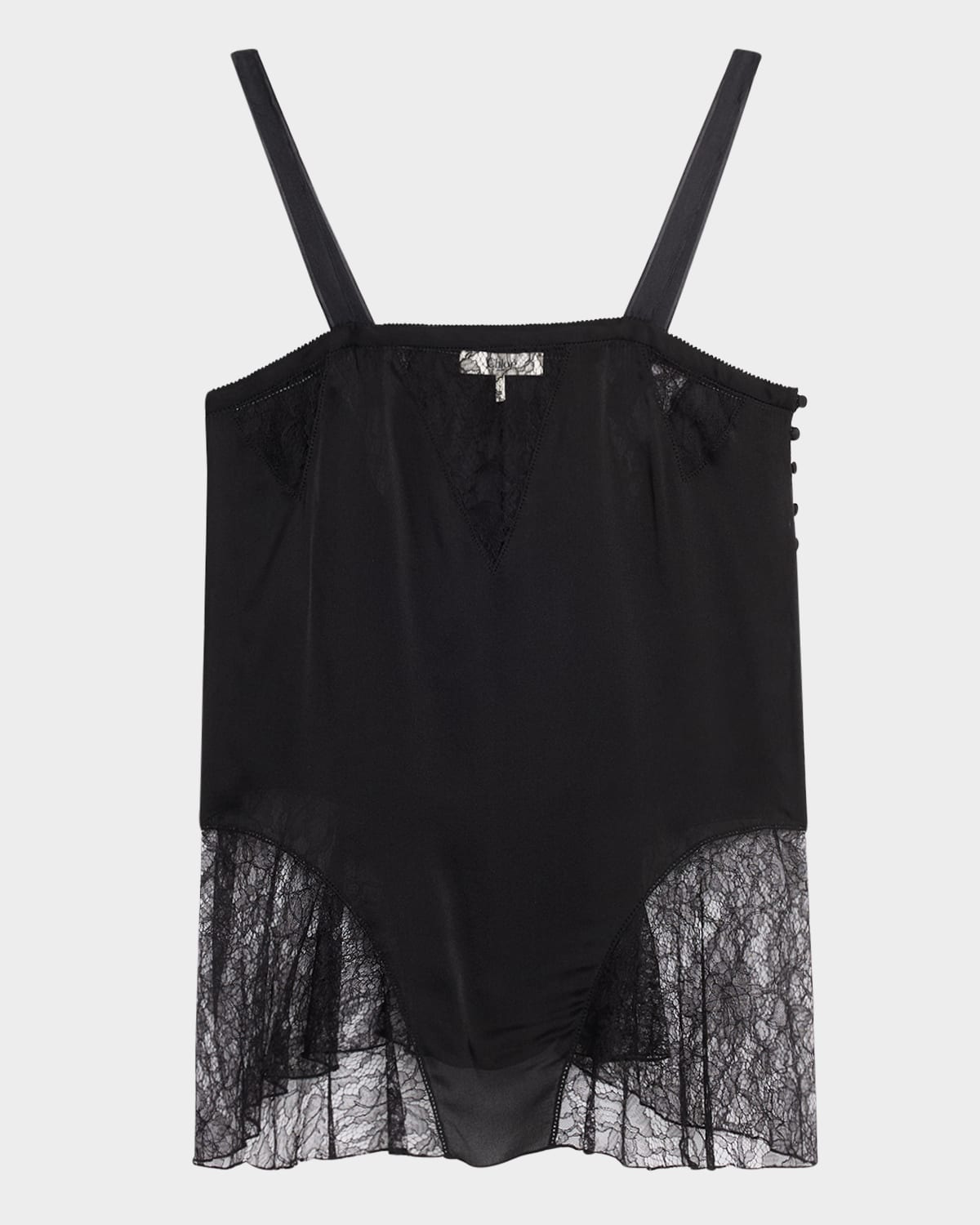 - Chloe silk slip camisole featuring lace insets - Square neckline - Sleeveless - Shift silhouette - Mini length - Slipover style - Silk/viscose/nylon/polyamide - Made in Italy