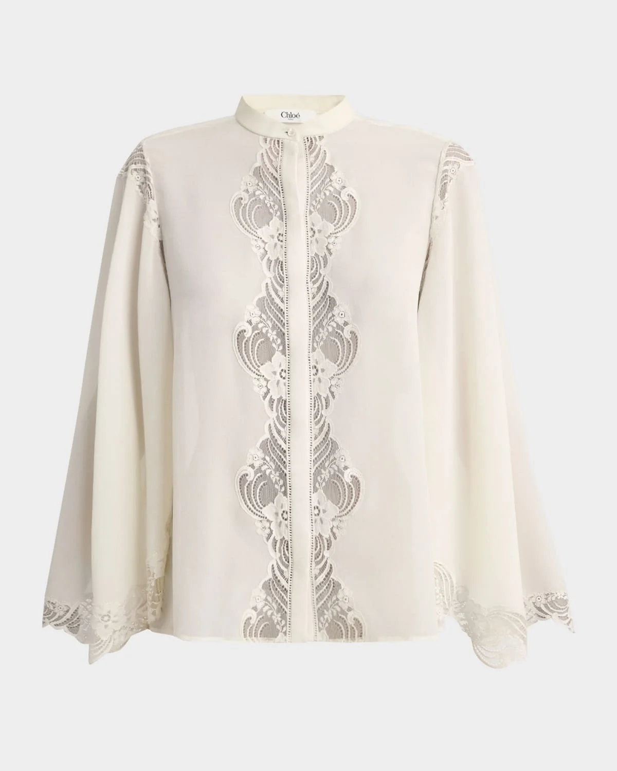- Chloe blouse featuring a lace trimmed placket and cuffs - Band collar; concealed button front - Long tulip sleeves - Relaxed fit - Silk/cotton - Dry clean - Imported
