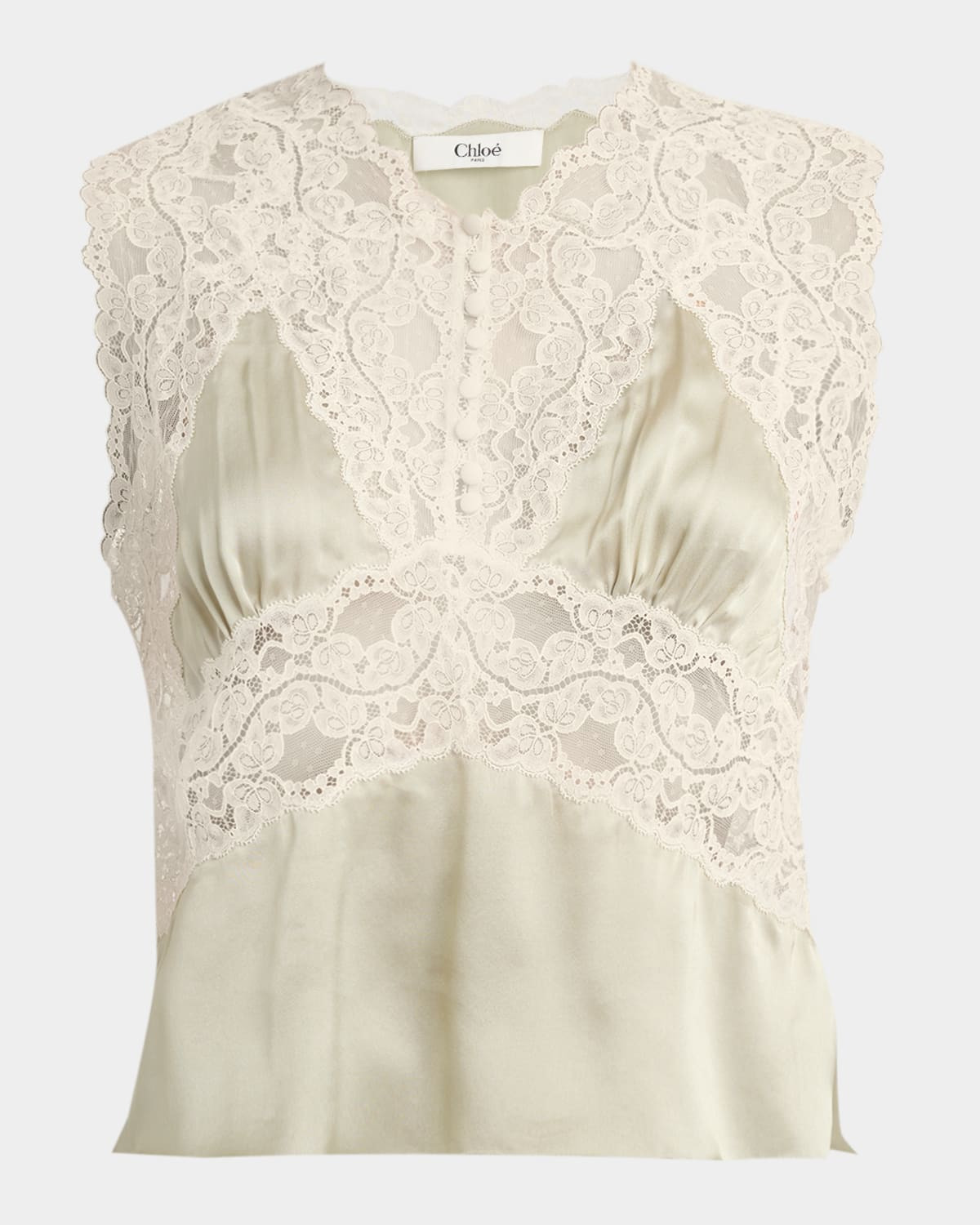 - Chloe lace and silk top featuring a button front detail - V neckline - Sleeveless - Relaxed fit - Button closure - Silk/nylon/polyamide - Dry clean - Made in Italy