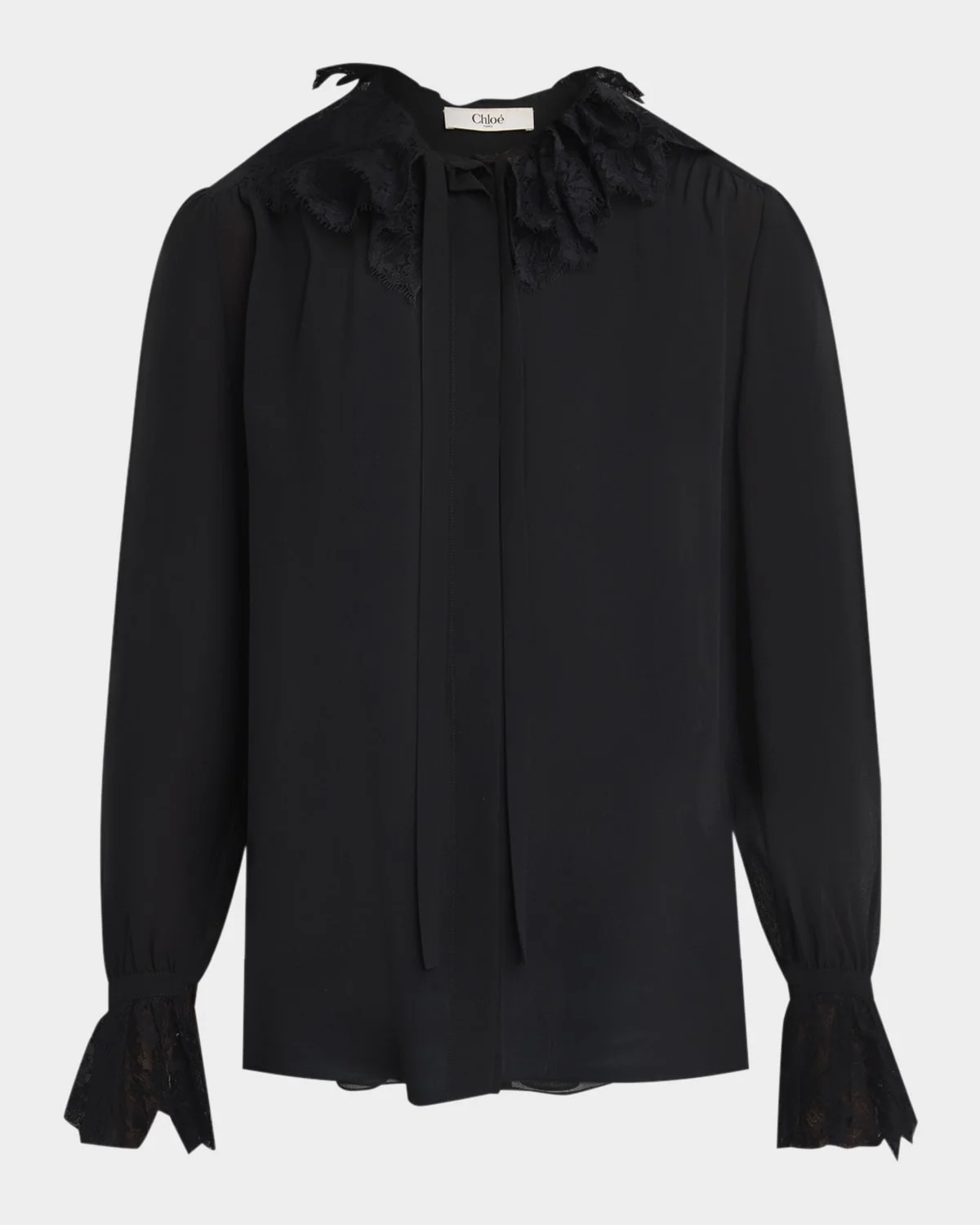 - Chloe fluid silk georgette blouse enhanced with ruffled lace trims and a neck tie - Spread collar; concealed button placket - Long poet sleeves - Ruffled cuffs - Draped silhouette - Silk/cotton/nylon/polyamide - Professional cleaning recommended - Trim: Lace - Made in Italy