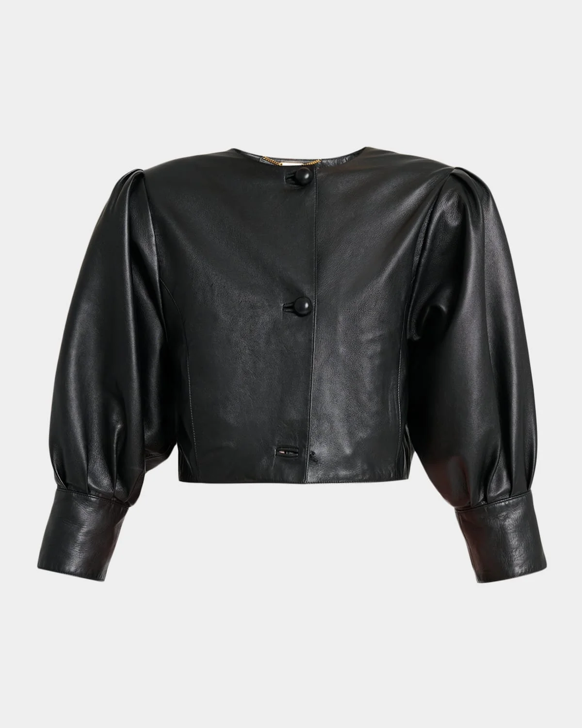 Chloe jacket is crafted from supple lambskin leather accented with pleat-gathered puff sleeves and shiny horn buttons Round neckline; single-breasted front Bracelet puff sleeves; button cuffs Slim fit Cropped length Button closure Leather/horn Lining: Cupro Made in Italy