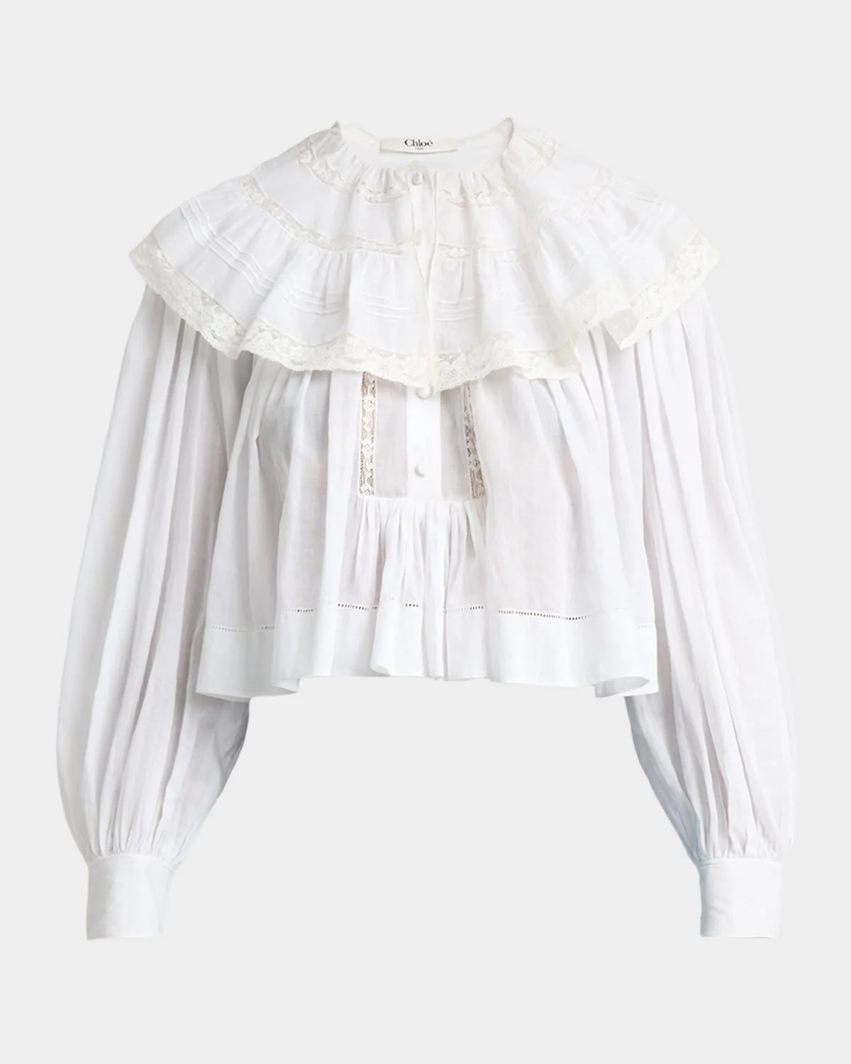 Adorned with a ruffled capelet design and delicate lace & nbsp;detailing, this Chloe blouse in gathered light cotton voile & nbsp;captures the essence of & nbsp;vintage-inspired charm with modern styling ease Round neckline; button front Blouson-style long sleeves; button barrel cuffs Loose fit Cropped length Cotton/nylon/polyamide Dry clean Imported