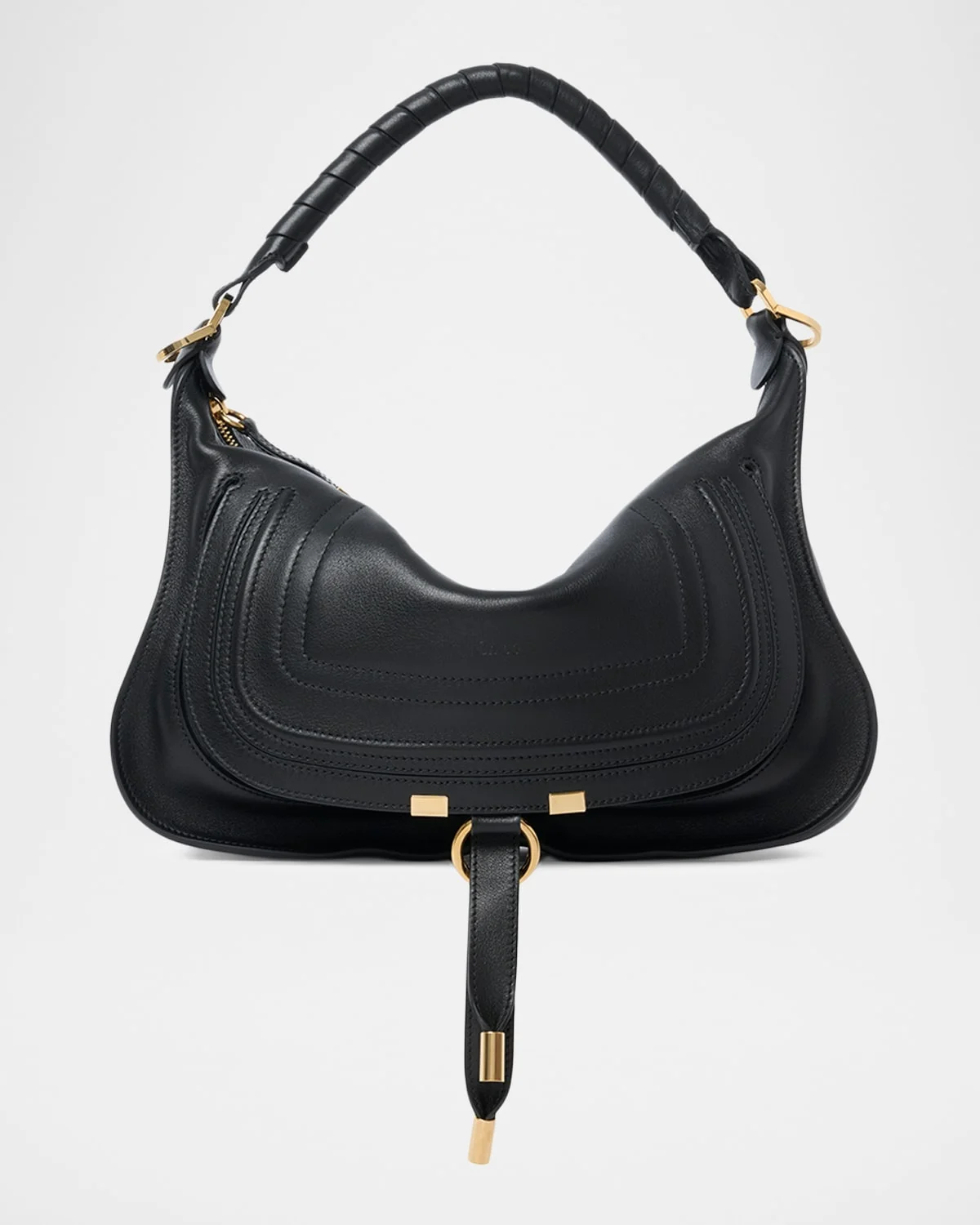 This "Marcie" shoulder bag from Chloe is crafted of smooth calfskin leather in a slouchy silhouette, finished with saddle stitching and a front leather tassel Handwrapped top handle, 7.9" drop Detachable, adjustable leather shoulder strap, 17.7"-23.2" drop Zip top closure Exterior, one flap pocket Interior, one slip pocket Lining: Linen/cotton Approx. 7.9"H x 13.4"W x 3.3"D Made in Italy