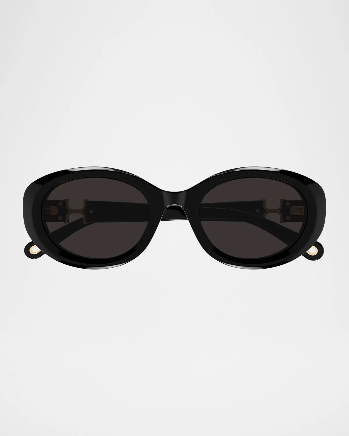 The "Marcie" acetate sunglasses by Chloe sport a shiny black beveled frame with the line's signature goldtone metal piece on the temples. Dropshaped openings at the temple tips make these sunglasses compatible with Chloe's eyewear jewelry. Lens/bridge/temple (in mm): 5322140 Oval frames Asian fit Fixed nose pads Thin, tapered arms 100% UVA/UVB protection Made in Japan