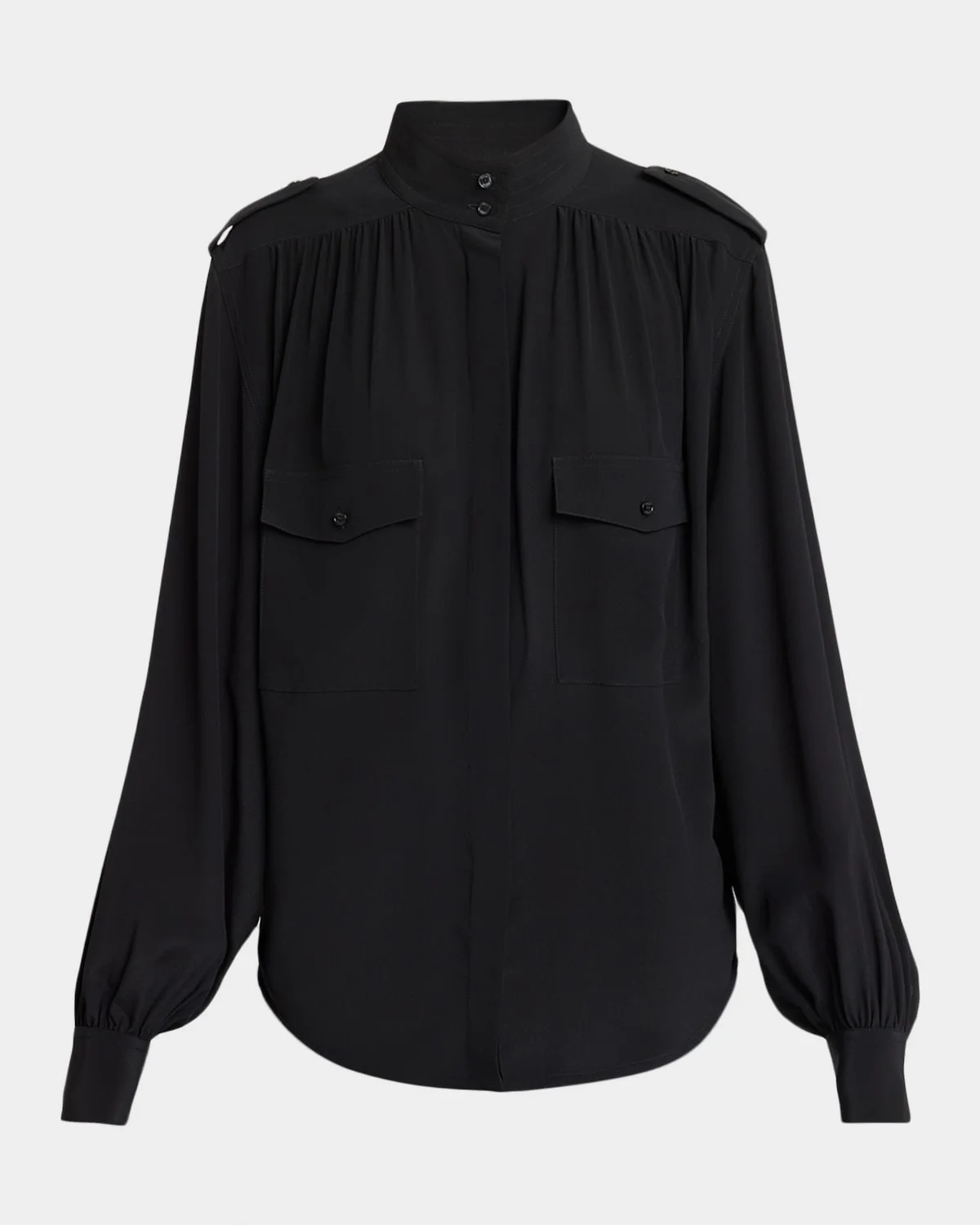 Fluid and freespirited, this Chloe blouson top in organic silk crepe de chine is finished with subtle utilitarian notes Twobutton tab collar; placket conceals button front Long sleeves; mitered button cuffs Buttoned epaulets Softly shirred front and back yoke Buttonflap chest pockets Shirttail hem Relaxed, blouson fit Silk Dry clean Imported