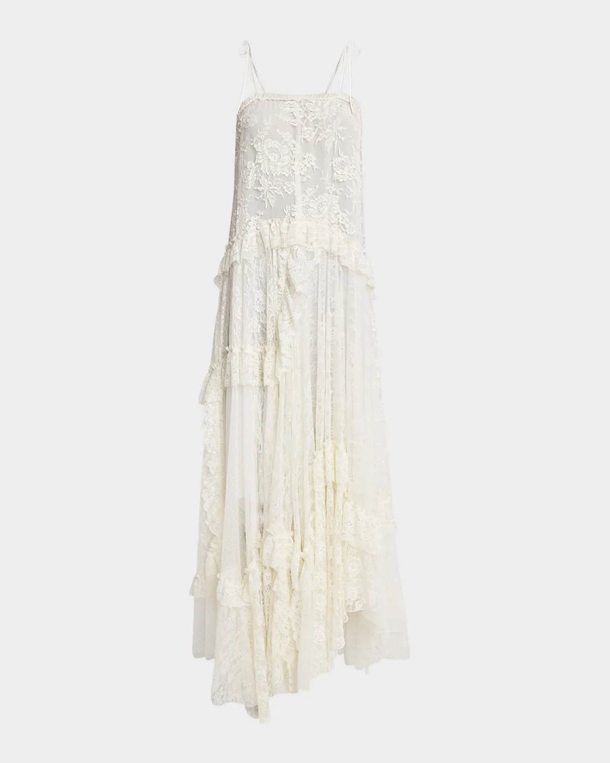 - Chloe maxi dress constructed in floral lace with scalloped ruffle trim - Elasticized square neckline - Sleeveless - Self-tie shoulder straps - Full length - A-line silhouette - Slipover style - Cotton/nylon/polyamide - Lining: Silk - Dry clean - Made in France