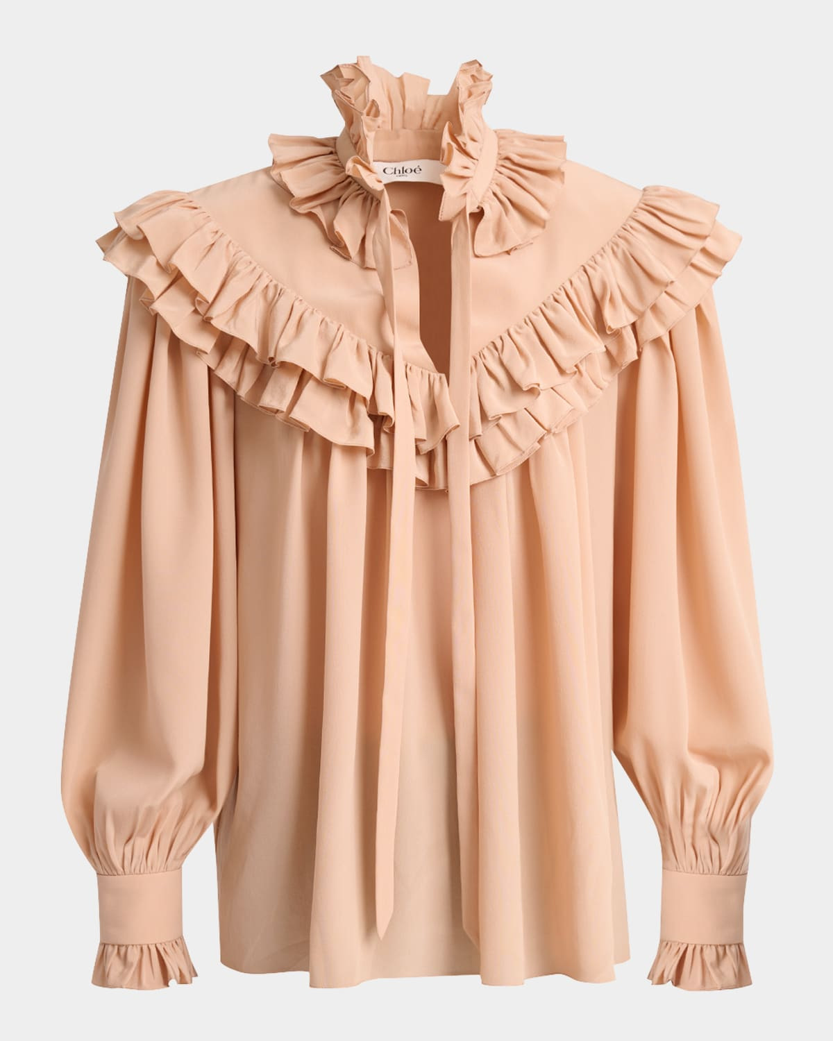 - Flowing with dreamy romance, this Chloe silk habotai blouse is finished with a tiered ruffle shoulder yoke and a neck tie ruffle collar - Stand collar; self-tie split V front - Long blouson sleeves; button cuffs - Loose fit - Pullover style - Silk - Lining: Acetate/silk - Dry clean, professional cleaning recommended - Imported