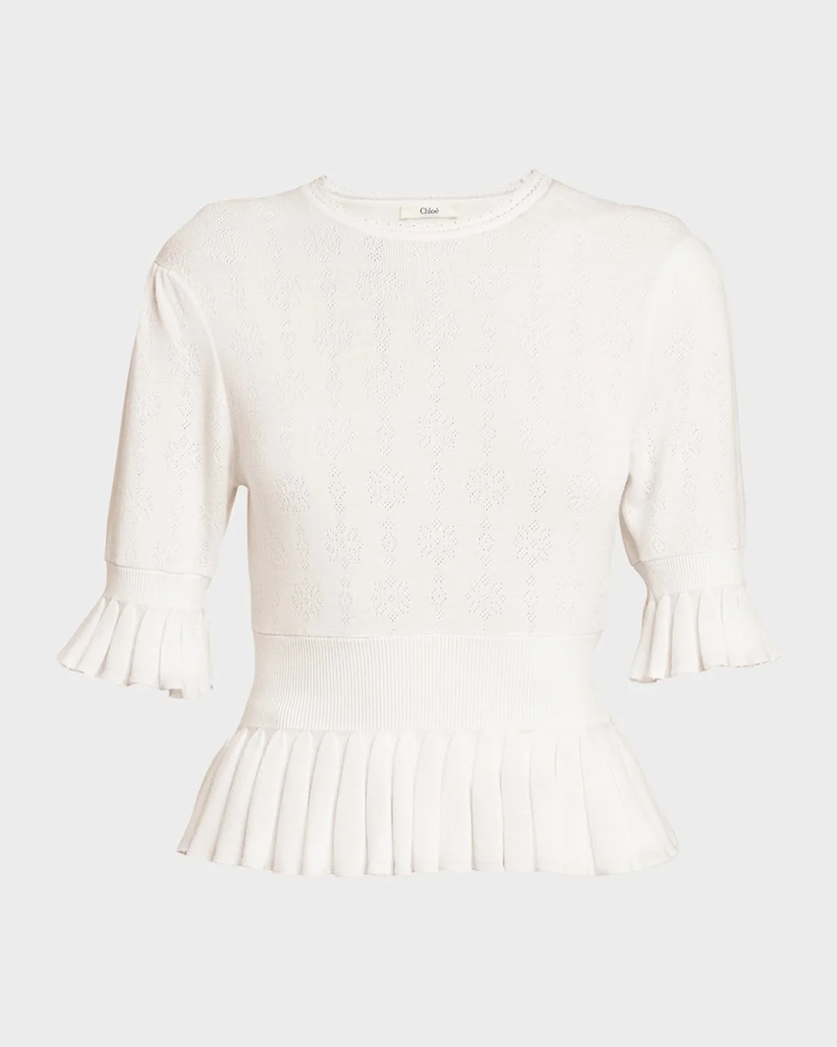 Crafted from pointelle knit, this sweater & nbsp;from Chloe features voluminous sleeves, a logo embroidered on the back, and & nbsp;pleated ruffles along the & nbsp;cuffs and hem Crew neckline Short puff sleeves Slim fit Hip length Pullover style Cotton/wool Professional cleaning recommended Imported SIZE & FITModel measurements: 5 & apos;10" tallModel is wearing a US size 4/Small