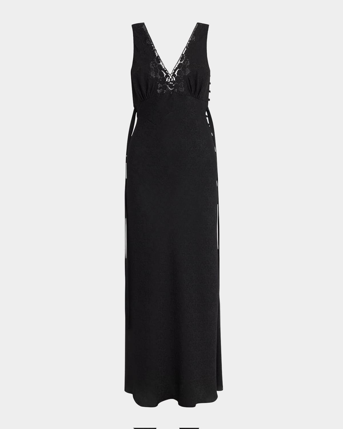 - Constructed of mini floral jacquard with lace inserts, this long silk dress by Chloe features a fluid fit and a ribbon tie on the back - V neckline - Sleeveless - Full length - Column silhouette - Fabric-covered side button closure - Silk/cotton/nylon/polyamide - Dry clean, professional cleaning recommended - Imported