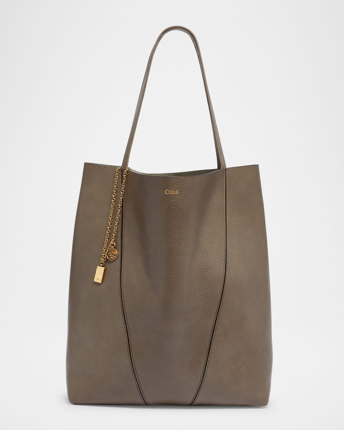 - Chloe "Spin" tote bag in shiny-grained leather - Shoulder straps with charm chain strap - Open top - Lining: Leather - Approx. 15.3"H x 13.7"W x 6.2"D - Professional cleaning recommended - Made in Italy