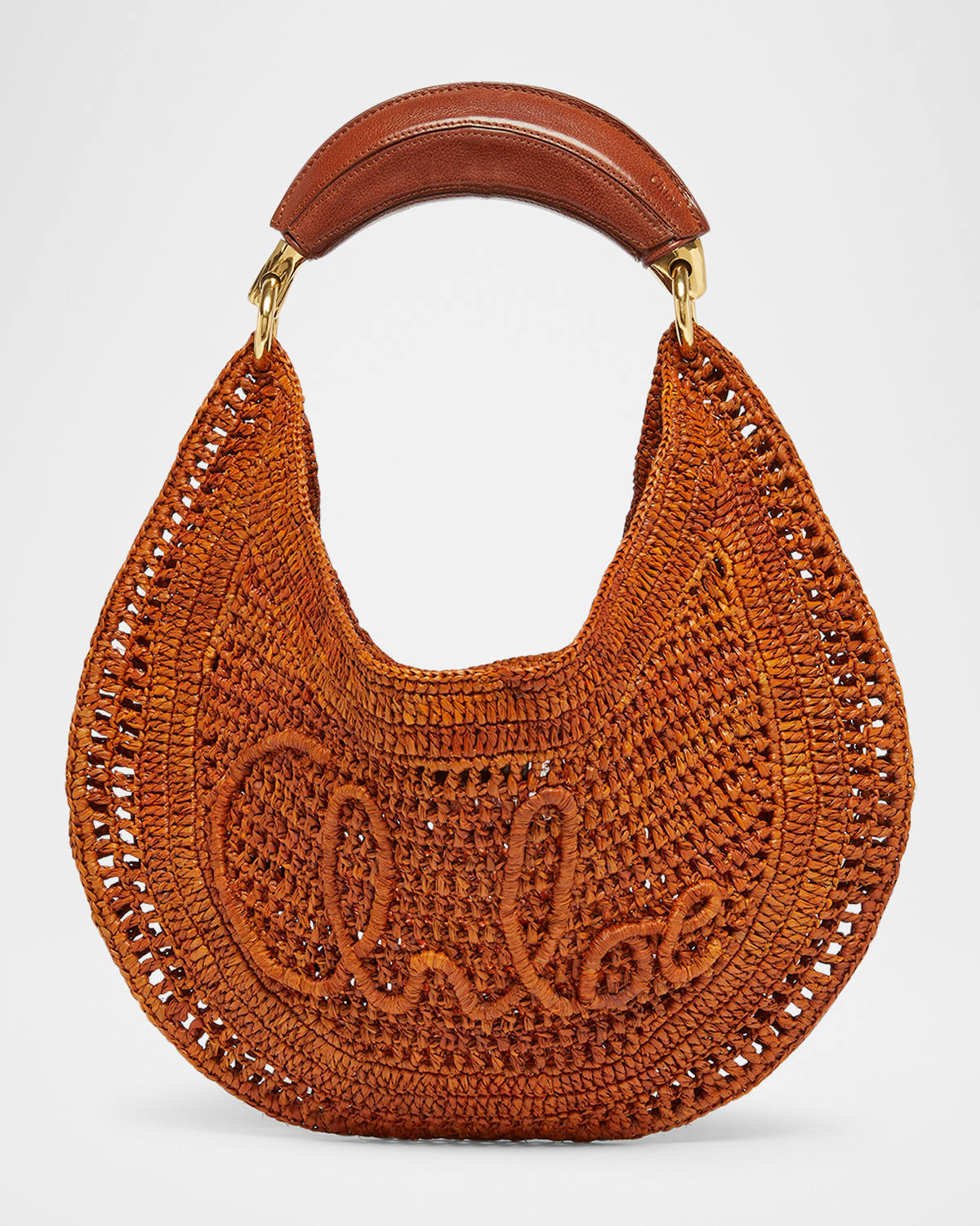 - Chloe "Summer" crochet raffia-like fabric and leather top handle bag with tonal logo lettering - Banana-covered metal top handle - Open top with magnetic closure - Approx. 8.4"H x 14.1"W x 0.4"D - Paper/leather - Imported