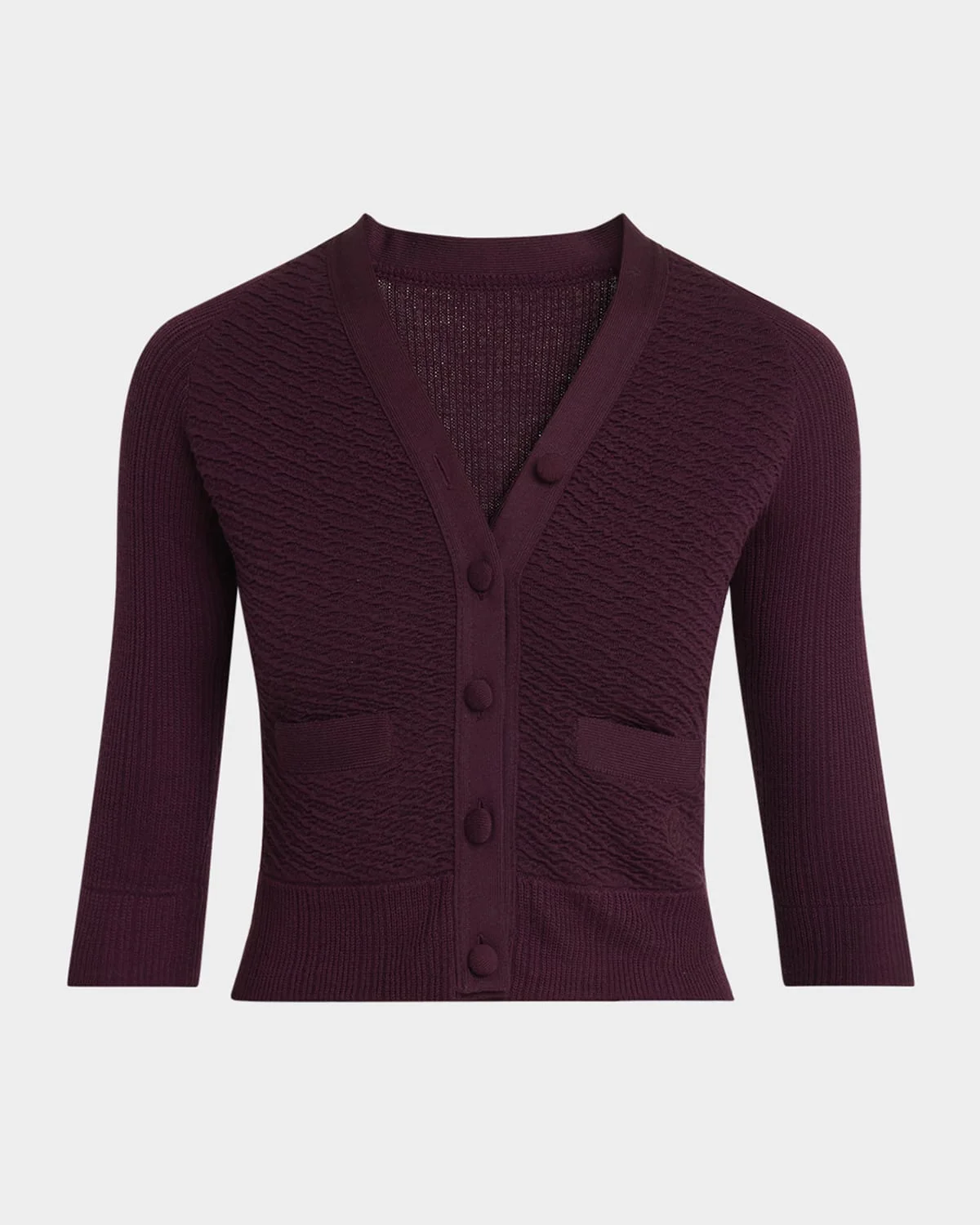 - Chloe textured cardigan sweater composed of fabric-covered buttons, patch pockets, and ribbed trim - V neckline; button placket - Elbow-length sleeves - Front patch pockets - Cropped length - Fitted - Wool - Dry clean - Imported