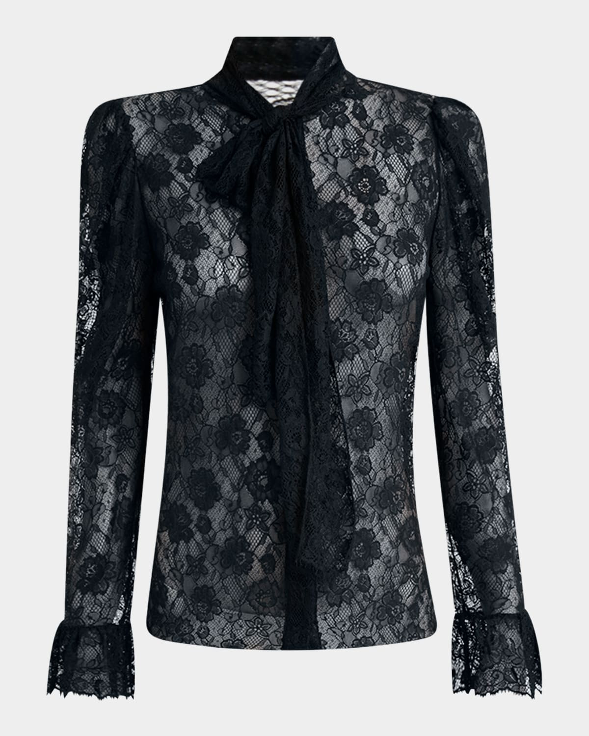 - Chloe lace blouse featuring a neck bow and ruffle cuffs - Band collar; button front - Long sleeves - Slim fit - Shirttail hem - Nylon/polyamide - Lining: Acetate/silk - Dry clean - Imported