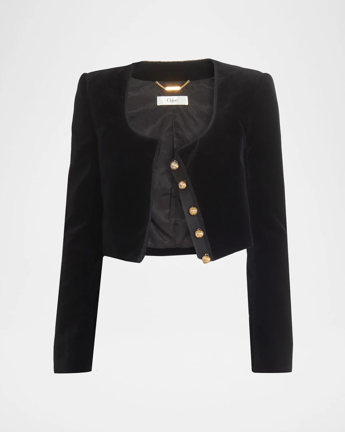 Crafted from plush velvet with goldtone ball buttons, this top coat by Chloe is framed with structured shoulders for a sophisticated silhouette Collarless neckline Long sleeves Relaxed fit Cropped hem Buttonandloop front closure Cotton/viscose Lining: Viscose/cotton Dry clean, professional cleaning recommended Made in Italy