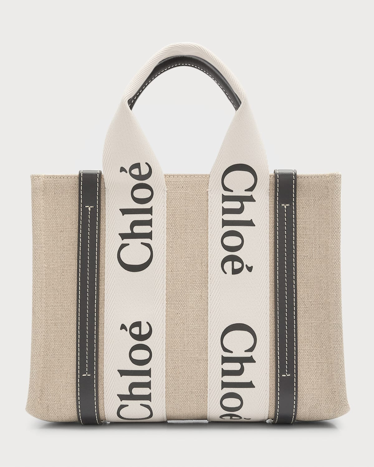 - Chloe "Woody" tote bag in eco linen and calf leather - Branded top handles - Detachable shoulder strap - Open top - Interior, one slip pocket - Lining: Linen - Approx. 7.9"H x 10.5"W x 3.2"D - Professional cleaning recommended, spot clean - Made in Italy