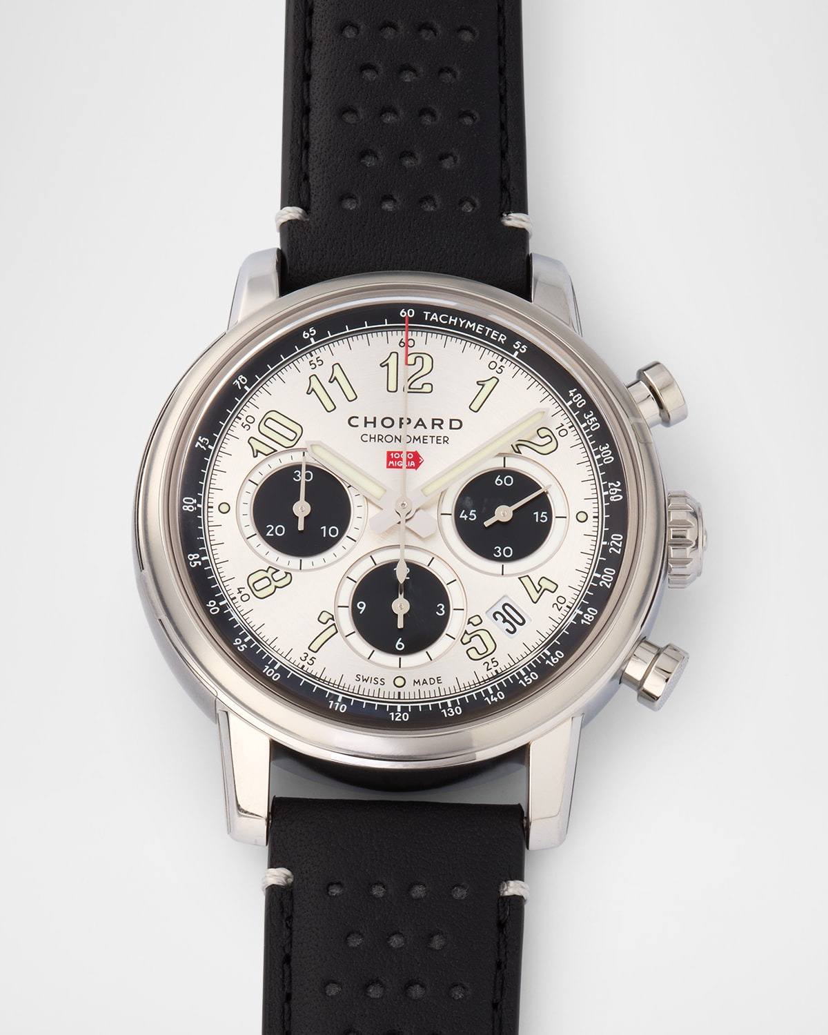 Chopard men's chronograph watch Approx. 40.5mm round case Stainless steel case and buckle Twotone "La Gara" dial with a circular satinfinish silvertoned background Luminescent hands and Arabic numerals Three black subdials; Tachymeter inner bezel Matte black perforated calfskin leather strap Adjustable length; thorn buckle Waterresistant to 50 meters Seethrough case back Made in Germany