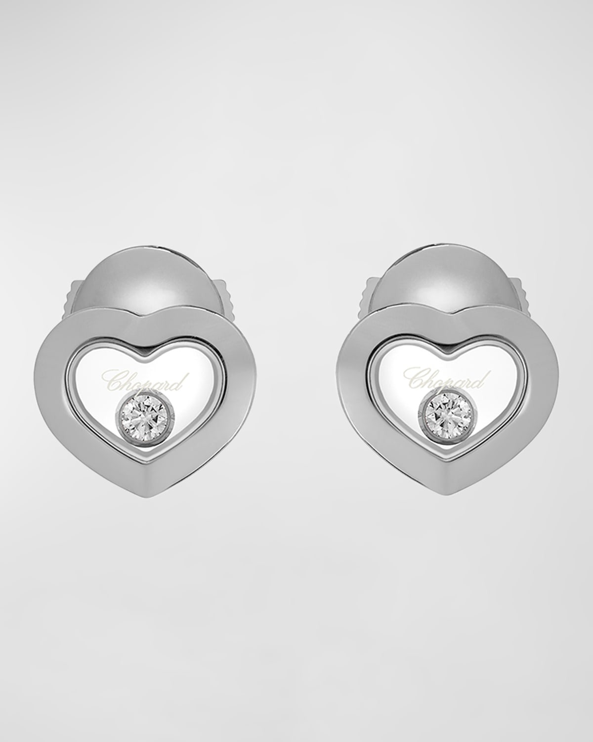 - Happy Diamonds jewelry is as unique as it is playful. The dancing diamonds are entirely free between two sapphire crystals, thus enabling them to move without restraint, and through this very movement enhance their inherent sparkle. Little Diamonds Do Great Things. - Happy Hearts Icon earrings by Chopard. - Polished 18-karat white gold hardware. - Heart windows with moving diamonds. - 0.10 total diamond carat weight. - Care Instructions: - Wash with a non-chemical liquid soap. Rinse piece under water, avoiding any stones. - Post backs for pierced ears. - Chopard Style # 83A054-1001