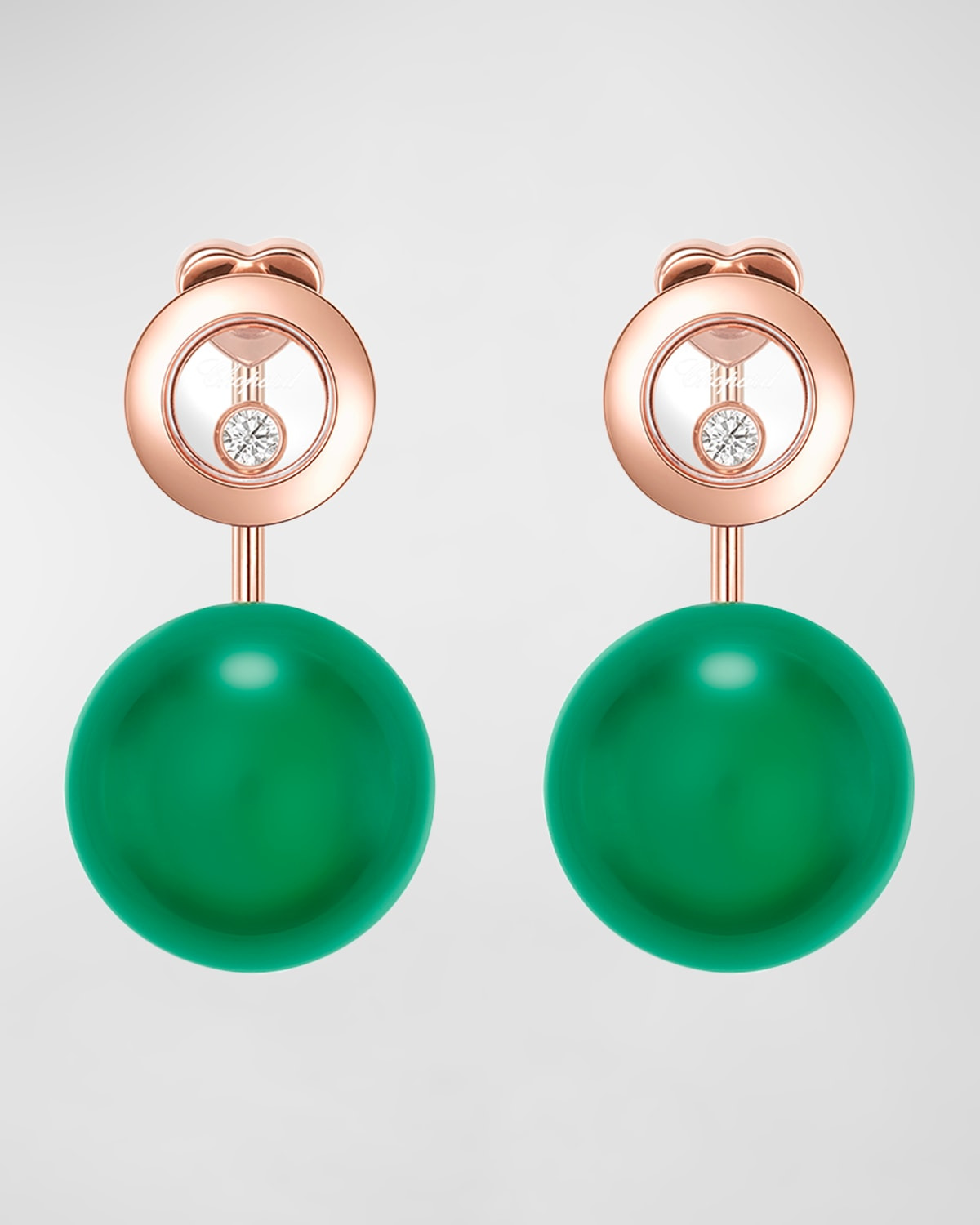 - Happy Diamonds green agate and diamond earrings are as unique as they are playful. The dancing diamonds are entirely free between two sapphire crystals, thus enabling them to move without restraint, and through this very movement to enhance their inherent sparkle. CLittle Diamonds Do Great Things. - Chopard earrings from the Happy Diamonds collection - Polished 18-karat rose gold - Green agate drops - Two see-through windows with free-floating diamonds - 0.10 total diamond carat weight - For pierced ears - Care Instructions: - Wash with a non-chemical liquid soap. Rinse piece under water, avoiding any stones. - Made in Germany