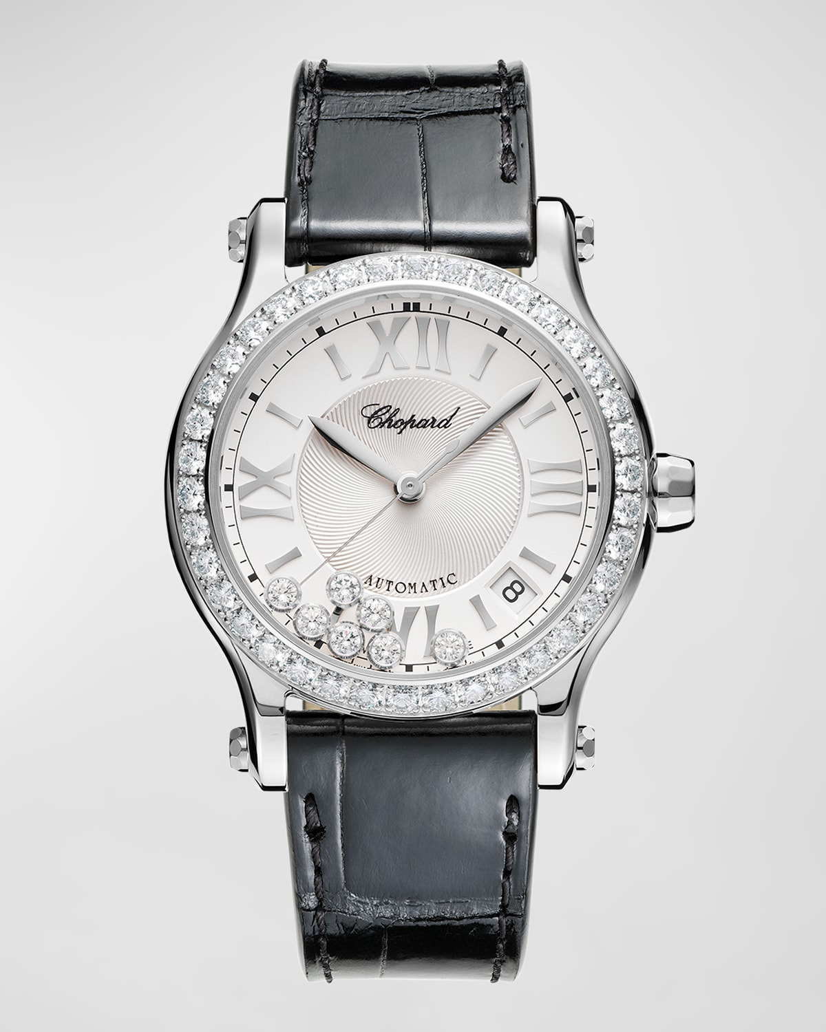 - About the Collection - The Happy Sport collection is the emblem of Chopard’s creativity and boldness. Its playful, free-spinning gems, dancing between two sapphire crystals, have captured the imagination since 1993 when Chopard became the first Maison to combine steel and diamonds. Little Diamonds Do Great Things. - Chopard automatic watch from the Happy Sport Collection. - 36mm stainless steel case. - Black patent alligator strap with thorn buckle. - Pave diamond bezel; 1.96 total carat weight. - Silver dial with guilloche center. - Seven diamond bezels float under the case window; 0.35 total carat weight. - 44 diamonds; 1.35 total combined diamond carat weight. - Sapphire winding crown; 0.17 total carat weight. - Self-winding mechanical Swiss movement. - Three hands; date window at 4:30. - Approx. 42-hour power reserve. - Water resistant to 3 ATM. - Made in Switzerland - Care Instructions: - Wash with a non-chemical liquid soap. Rinse piece under water, avoiding any stones. - Chopard Style # 278559-3003