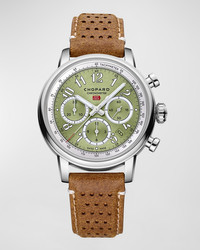 Chopard chronograph watch Case dimensions: approx. 40.5mm Round case in Chopard Lucent Steel™ Tachymeter bezel with 18karat yellow gold Lacquered "Verde Chiaro" green dial Arabic numerals and three subdials Square date window at 4:30 index Perforated leather strap with thorn buckle Transparent case back Water resistant to 5 ATM Automatic movement Adjustable length Made in Switzerland Care Instructions: Wash with a nonchemical liquid soap. Rinse piece under water, avoiding any stones.