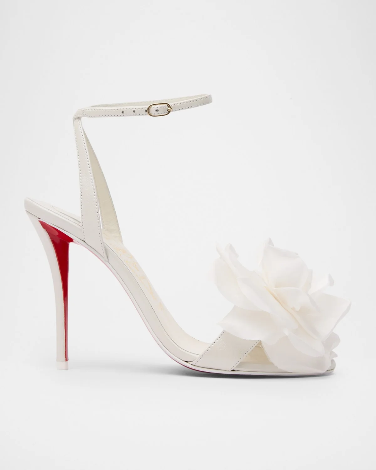 The "Miss Z" pumps by Christian Louboutin are crafted from smooth leather with a tonal silk satin floral applique 4.00 in / 100 mm covered stiletto heel Open toe Adjustable ankle strap Signature Louboutin red leather outsole Made in Italy