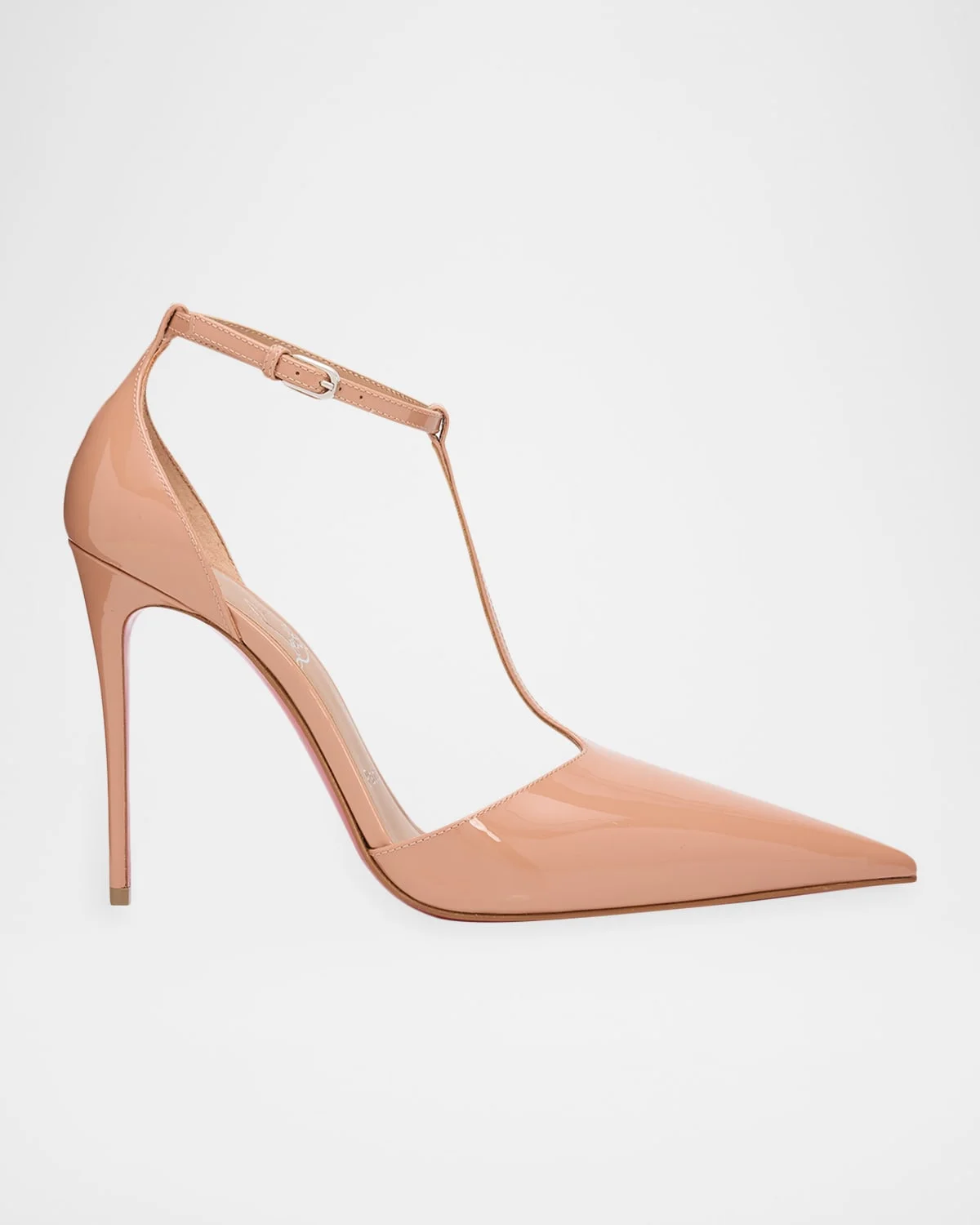 Christian Louboutin & apos;s "Kate Max" pumps are crafted from glossy patent leather & nbsp; 4.33 in / 110 mm stiletto heel Pointed toe T-strap vamp Adjustable ankle strap Signature Louboutin red leather outsole Made in Italy