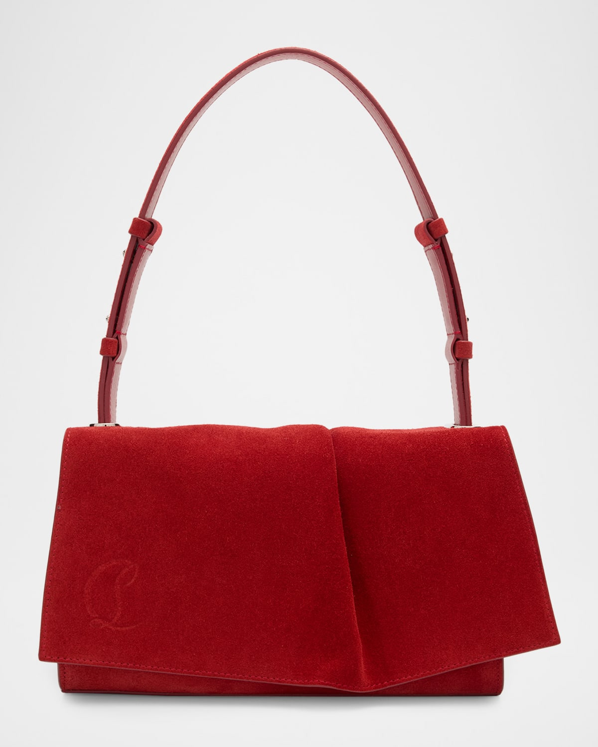 - Christian Louboutin "Baggy" shoulder bag in suede and leather - Adjustable shoulder strap - Flap top with magnetic and drawstring closures - Interior, one zip pocket - Signature red lining - Lining: Leather/cotton - Approx. 6.7"H x 9.8"W x 3.9"D - Made in Italy
