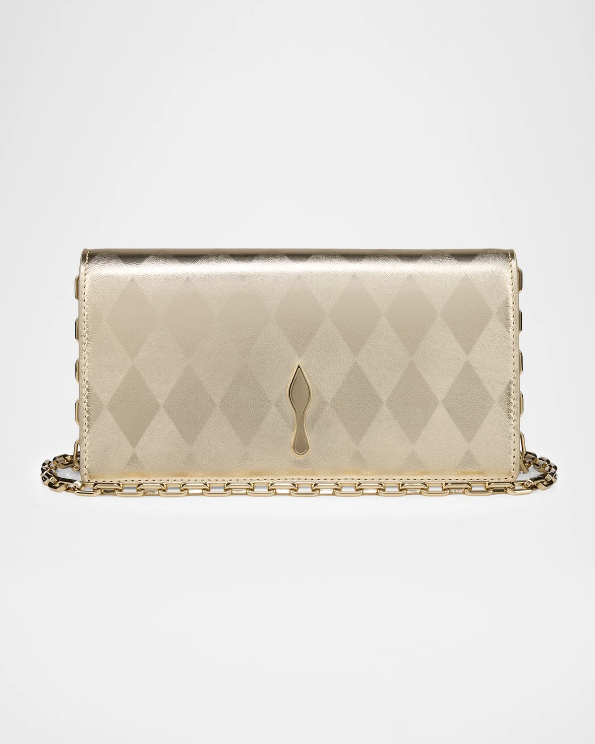 This Christian Louboutin "Bettina" clutch bag is slim and structured, made of diamondshaped laminated nappa lambskin leather with the signature sole silhouette accent Detachable chain crossbody strap Can be worn as a clutch or crossbody bag Flap top with magnetic closure Interior, three card slots Approx. 4.7"H x 8.7"W x 2"D Made in Italy